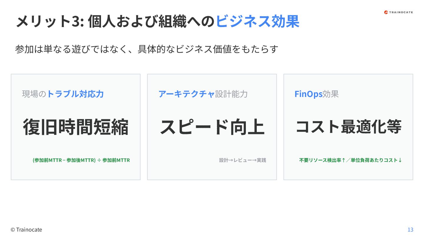 メリット3: 個⼈および組織へのビジネス効果 参加は単なる遊びではなく、具体的なビジネス価値をもたらす 現場のトラブル対応⼒ 復旧時間短縮 (参加前MTTR − 参加後MTTR) ÷ 参加前MTTR