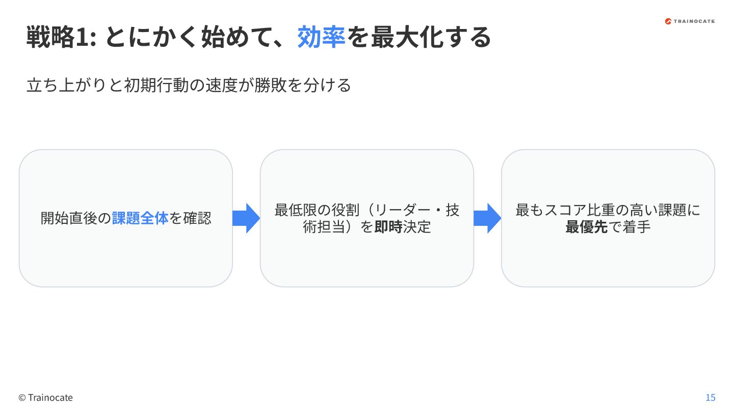 戦略1: とにかく始めて、効率を最⼤化する ⽴ち上がりと初期⾏動の速度が勝敗を分ける 開始直後の課題全体を確認 最低限の役割(リーダー‧技 術担当)を即時決定 最もスコア⽐重の⾼い課題に 最優先で着⼿ © Trainocate