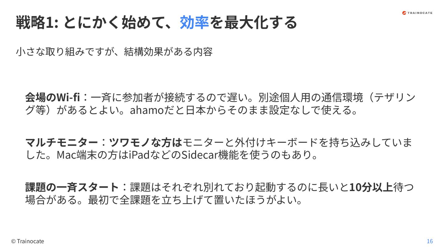 戦略1: とにかく始めて、効率を最⼤化する ⼩さな取り組みですが、結構効果がある内容 © Trainocate 16 会場のWi-fi:⼀⻫に参加者が接続するので遅い。別途個⼈⽤の通信環境(テザリン グ等)があるとよい。ahamoだと⽇本からそのまま設定なしで使える。 マルチモニター:ツワモノな⽅はモニターと外付けキーボードを持ち込みしていま した。Mac端末の⽅はiPadなどのSidecar機能を使うのもあり。