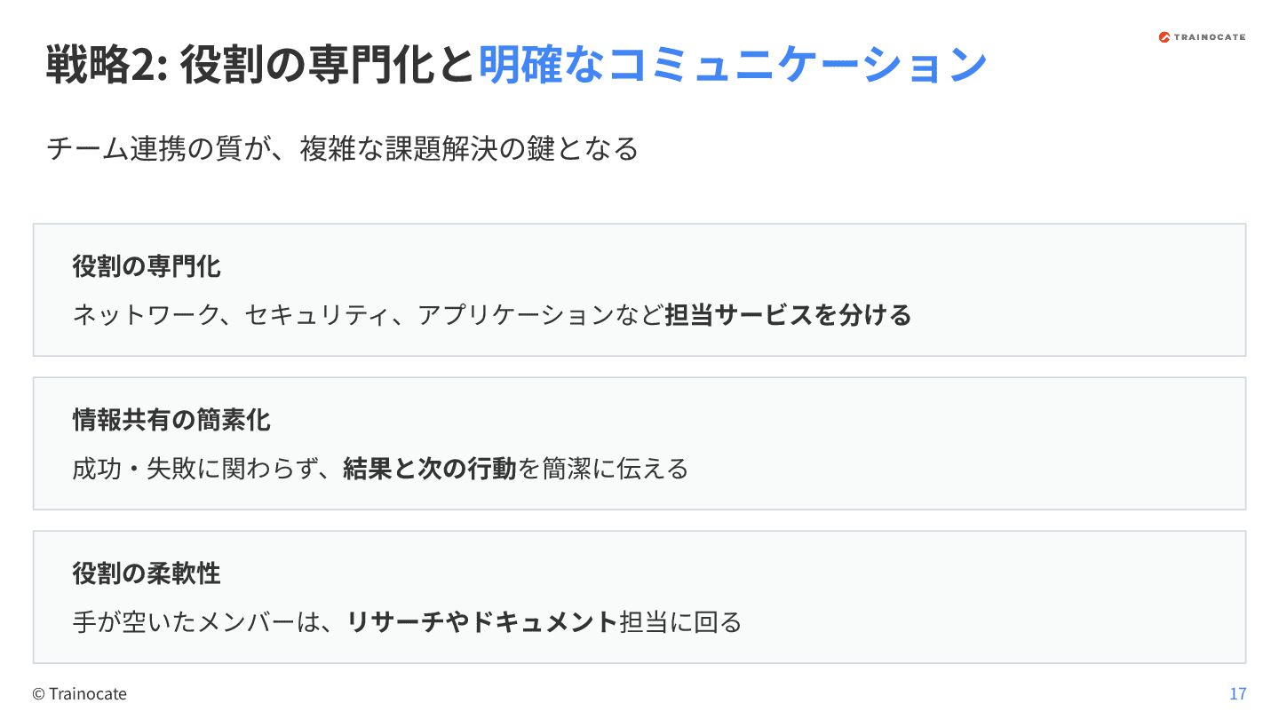 戦略2: 役割の専⾨化と明確なコミュニケーション チーム連携の質が、複雑な課題解決の鍵となる 役割の専⾨化 ネットワーク、セキュリティ、アプリケーションなど担当サービスを分ける 情報共有の簡素化 成功‧失敗に関わらず、結果と次の⾏動を簡潔に伝える 役割の柔軟性 ⼿が空いたメンバーは、リサーチやドキュメント担当に回る ©