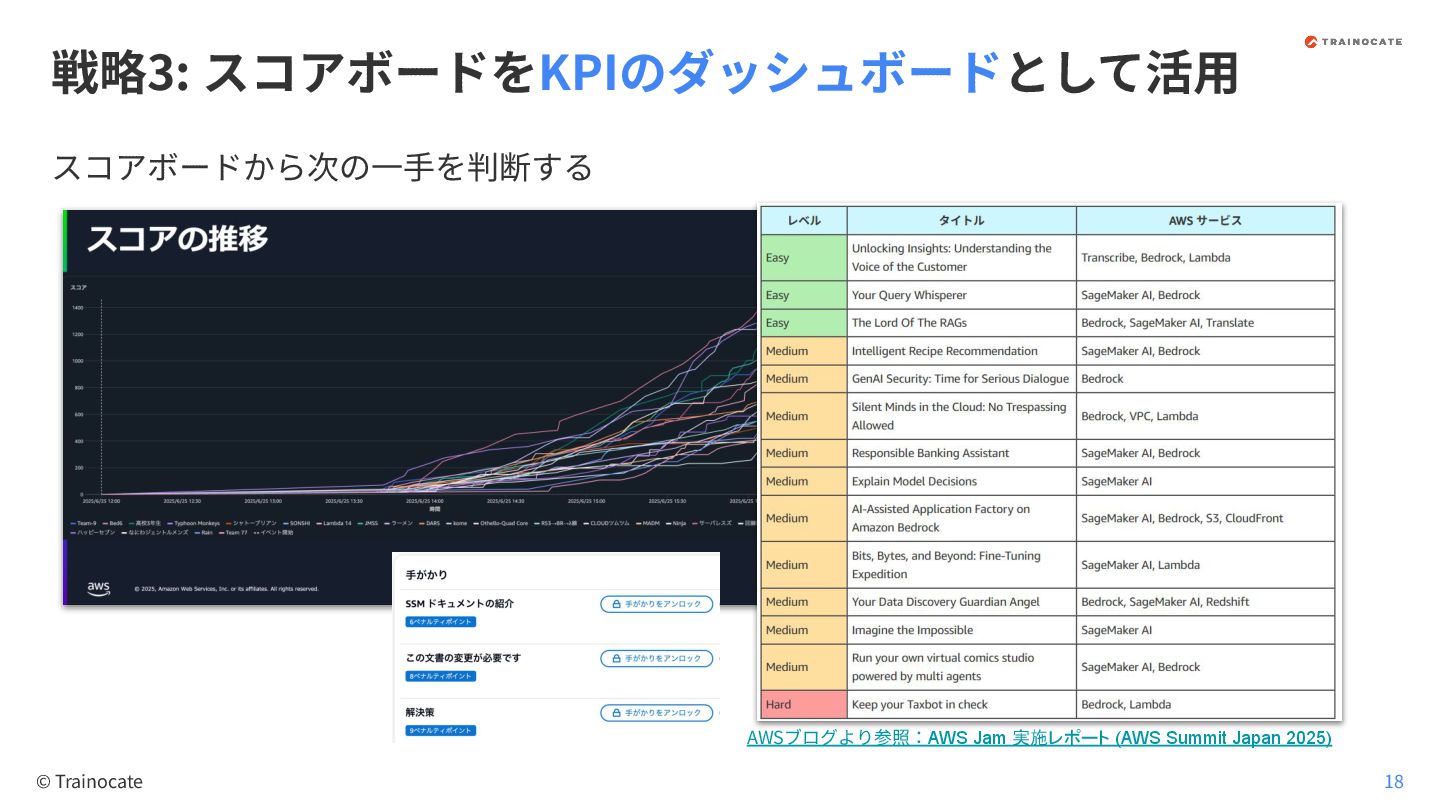 戦略3: スコアボードをKPIのダッシュボードとして活⽤ スコアボードから次の⼀⼿を判断する © Trainocate 18 AWSブログより参照:AWS Jam 実施レポート (AWS