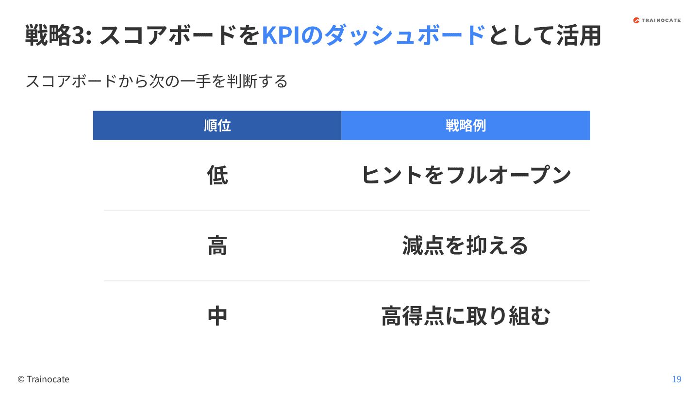 戦略3: スコアボードをKPIのダッシュボードとして活⽤ スコアボードから次の⼀⼿を判断する 順位 戦略例 低 ヒントをフルオープン ⾼ 減点を抑える 中