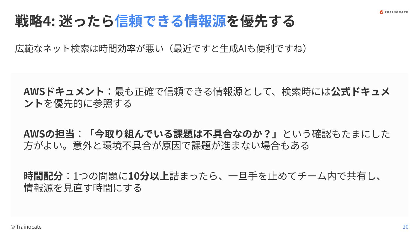 戦略4: 迷ったら信頼できる情報源を優先する 広範なネット検索は時間効率が悪い(最近ですと⽣成AIも便利ですね) AWSドキュメント:最も正確で信頼できる情報源として、検索時には公式ドキュメ ントを優先的に参照する AWSの担当:「今取り組んでいる課題は不具合なのか?」という確認もたまにした ⽅がよい。意外と環境不具合が原因で課題が進まない場合もある 時間配分:1つの問題に10分以上詰まったら、⼀旦⼿を⽌めてチーム内で共有し、 情報源を⾒直す時間にする ©