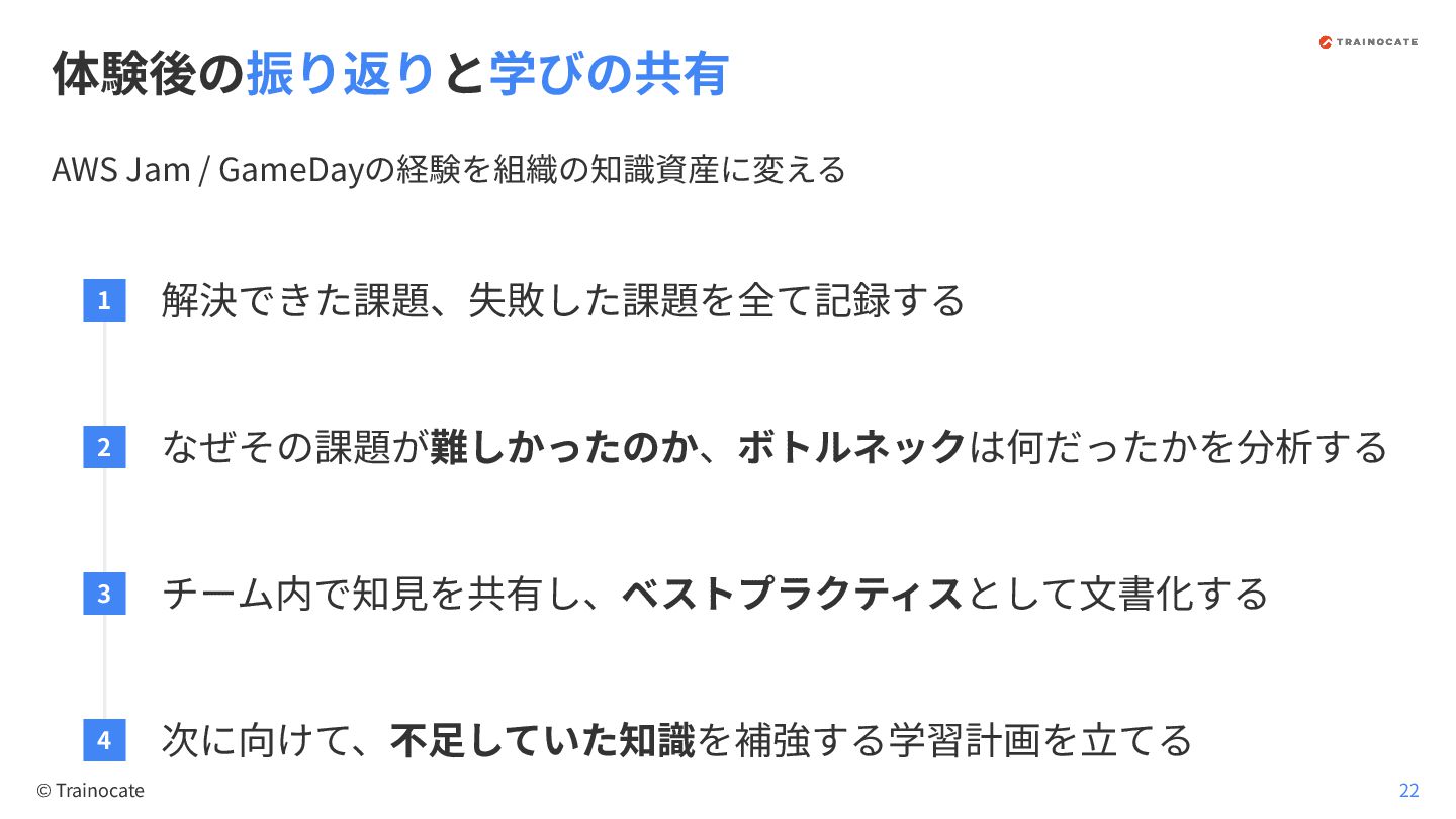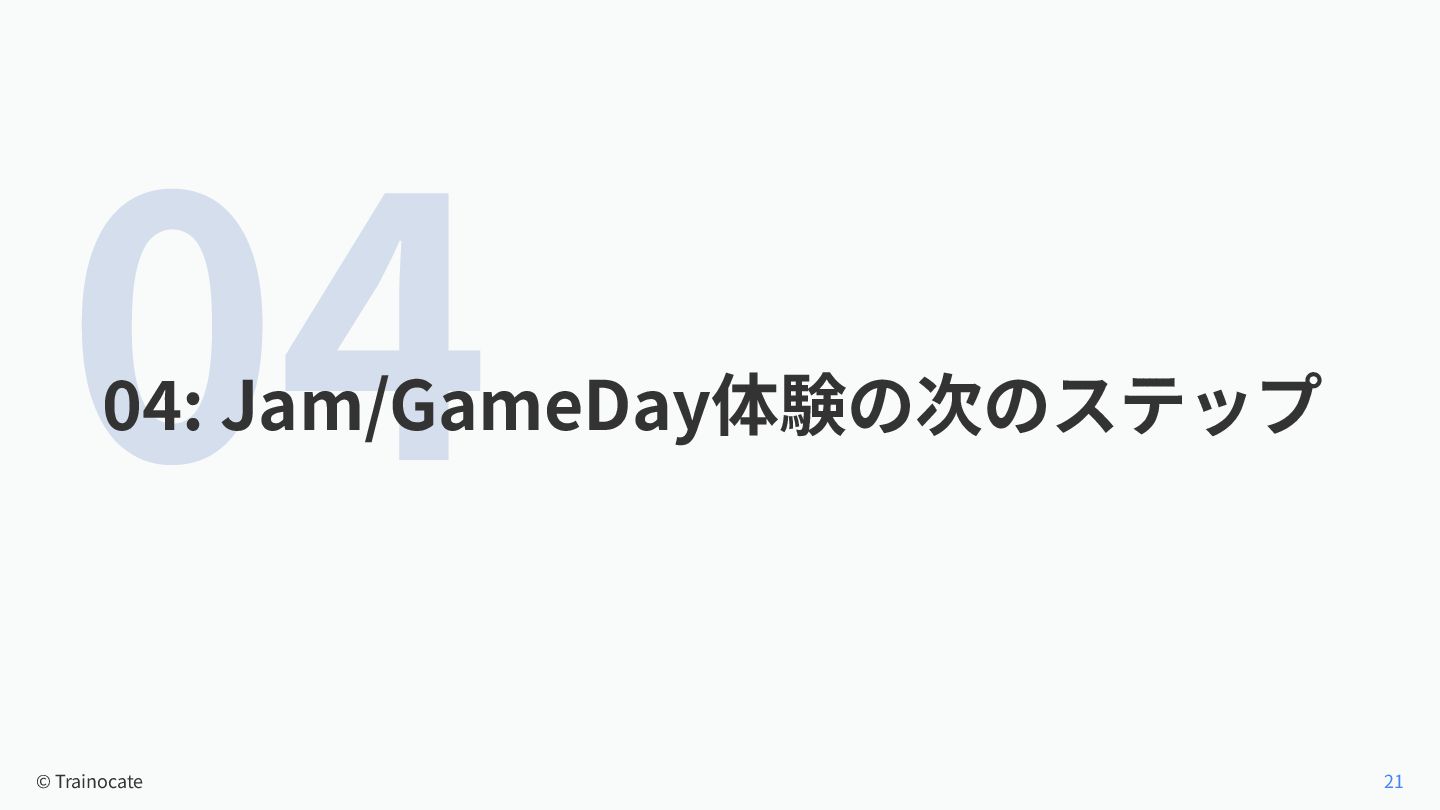04 04: Jam/GameDay体験の次のステップ © Trainocate 21