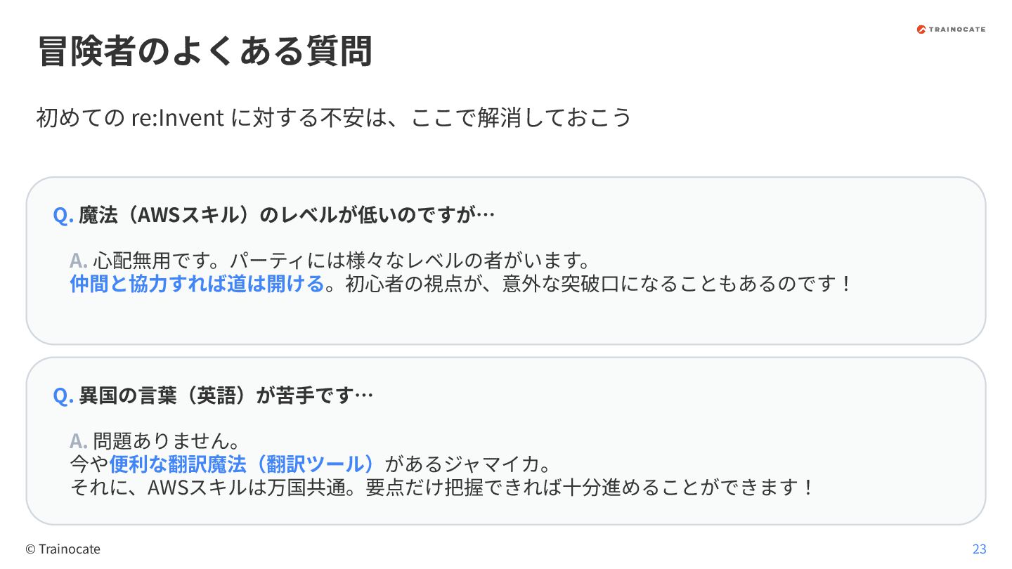 冒険者のよくある質問 初めての re:Invent に対する不安は、ここで解消しておこう Q. 魔法(AWSスキル)のレベルが低いのですが… A. ⼼配無⽤です。パーティには様々なレベルの者がいます。 仲間と協⼒すれば道は開ける。初⼼者の視点が、意外な突破⼝になることもあるのです! Q.