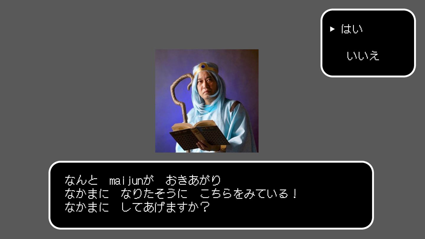 なんと maijunが おきあがり なかまに なりたそうに こちらをみている! なかまに してあげますか? ▶ はい