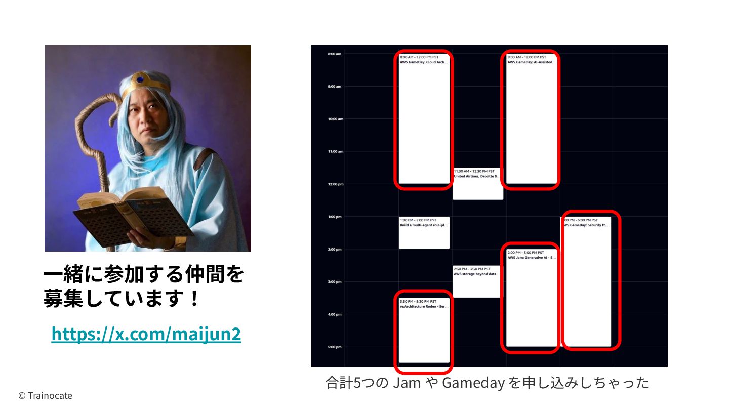 © Trainocate ⼀緒に参加する仲間を 募集しています! 合計5つの Jam や Gameday を申し込みしちゃった https://x.com/maijun2