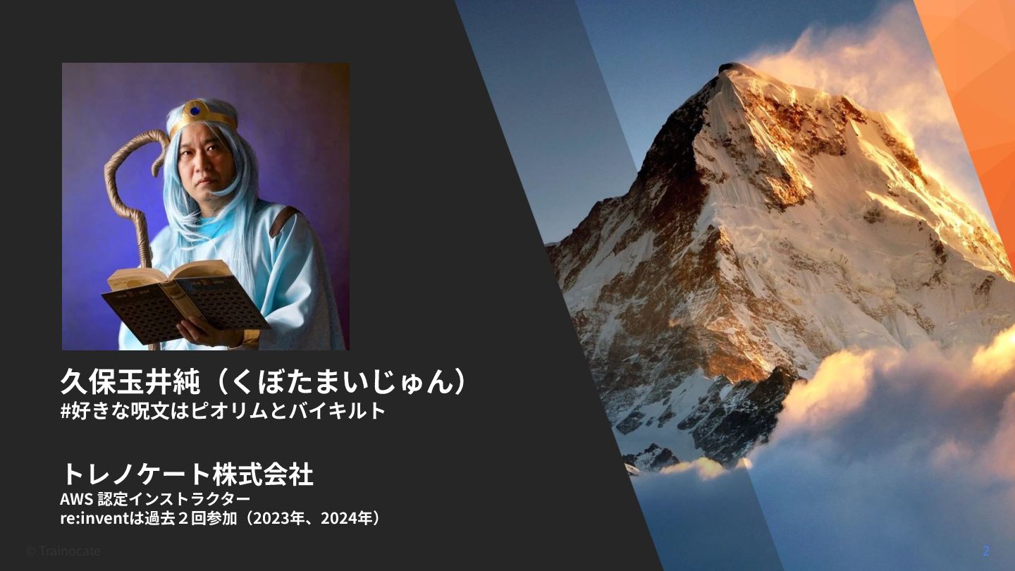 © Trainocate 2 トレノケート株式会社 AWS 認定インストラクター re:inventは過去2回参加(2023年、2024年) 久保⽟井純(くぼたまいじゅん) #好きな呪⽂はピオリムとバイキルト