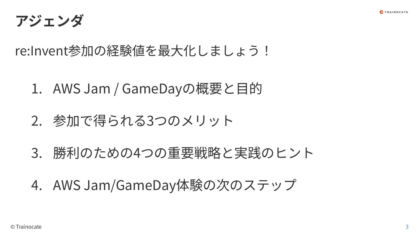 アジェンダ re:Invent参加の経験値を最⼤化しましょう! 1. AWS Jam / GameDayの概要と⽬的 2. 参加で得られる3つのメリット 3.