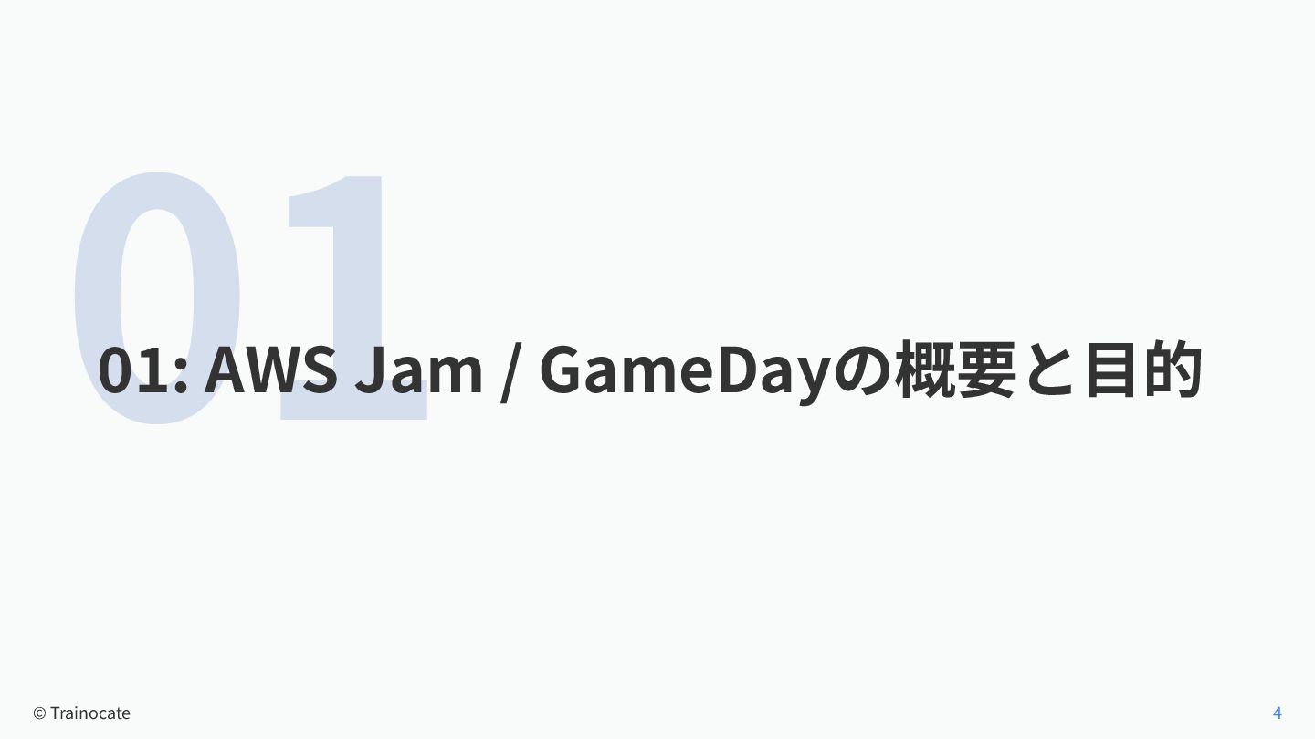 01 01: AWS Jam / GameDayの概要と⽬的 © Trainocate 4