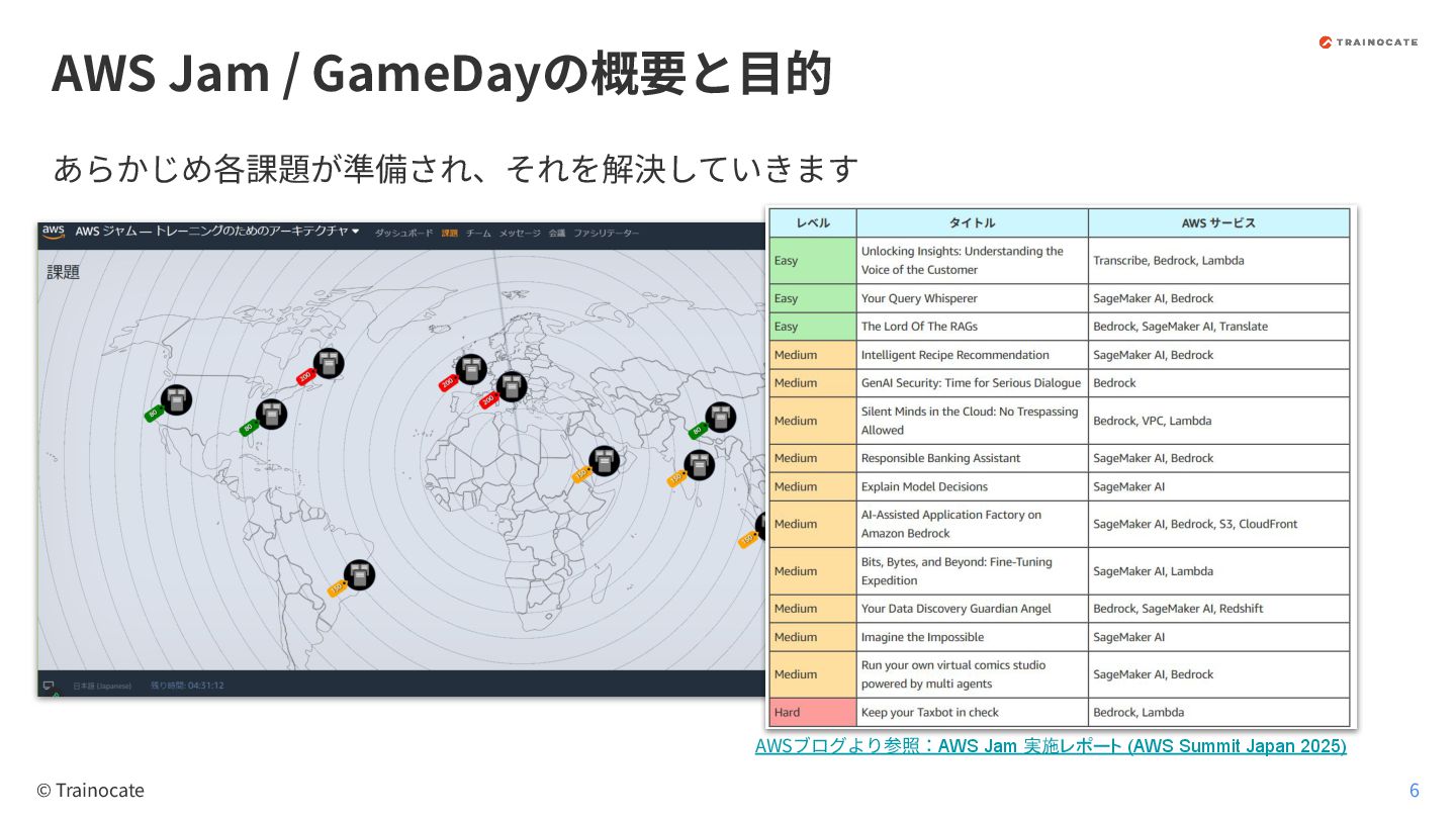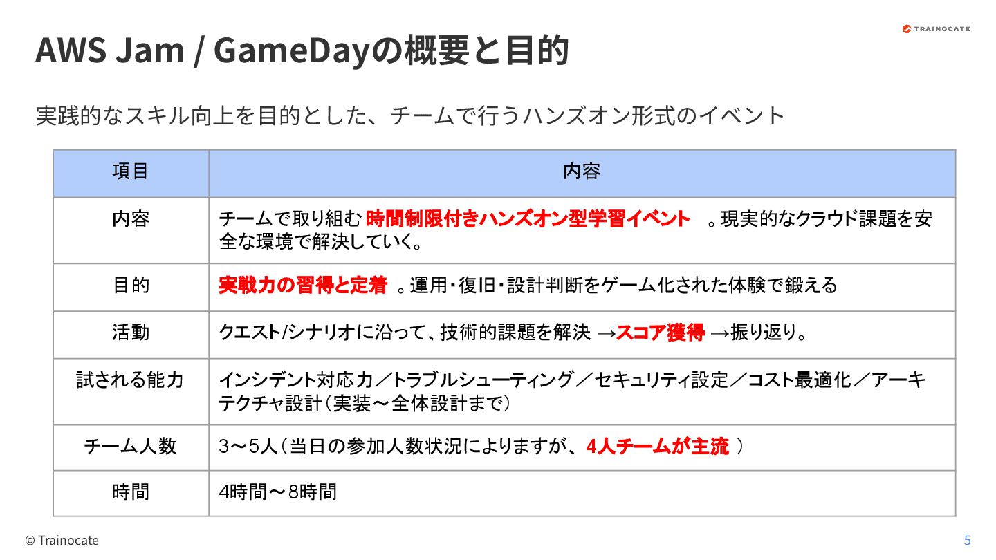 AWS Jam / GameDayの概要と⽬的 実践的なスキル向上を⽬的とした、チームで⾏うハンズオン形式のイベント © Trainocate 5 項目 内容