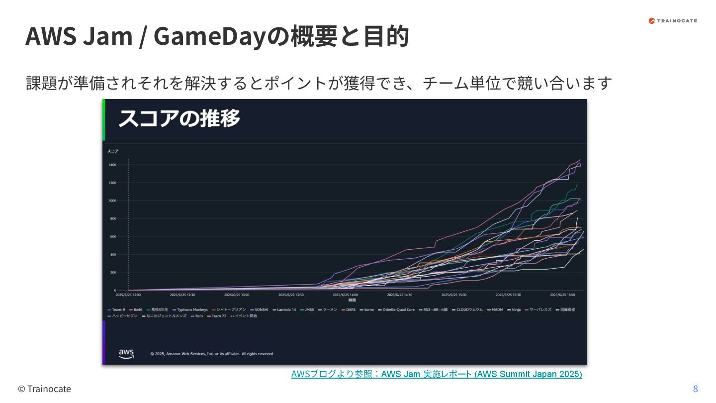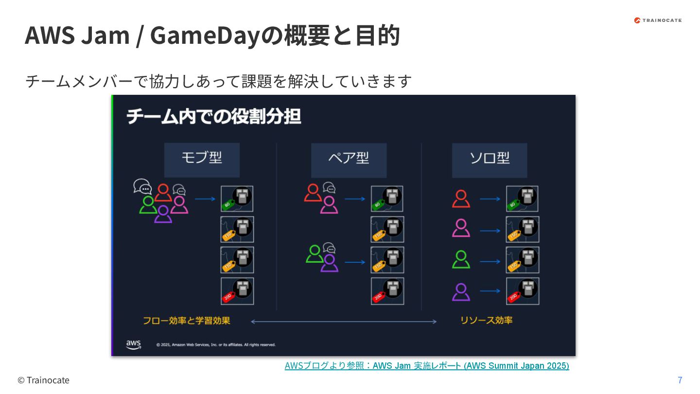 AWS Jam / GameDayの概要と⽬的 チームメンバーで協⼒しあって課題を解決していきます © Trainocate 7 AWSブログより参照:AWS Jam