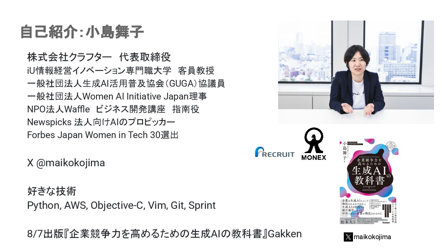 Forbes Japan Women in Tech 30選出 X @maikokojima 好きな技術 Python, AWS, Objective-C, Vim, Git, Sprint 8/7出版『企業競争力を高めるための生成AIの教科書』Gakken 自己紹介:小島舞子 maikokojima