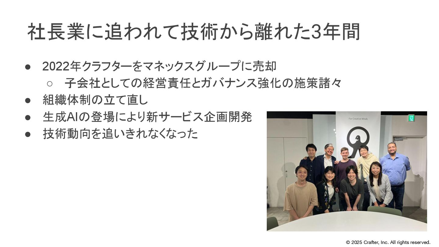 © 2025 Crafter, Inc. All rights reserved. 社長業に追われて技術から離れた3年間 • 2022年クラフターをマネックスグループに売却