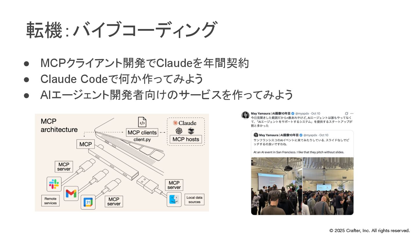 © 2025 Crafter, Inc. All rights reserved. 転機:バイブコーディング • MCPクライアント開発でClaudeを年間契約