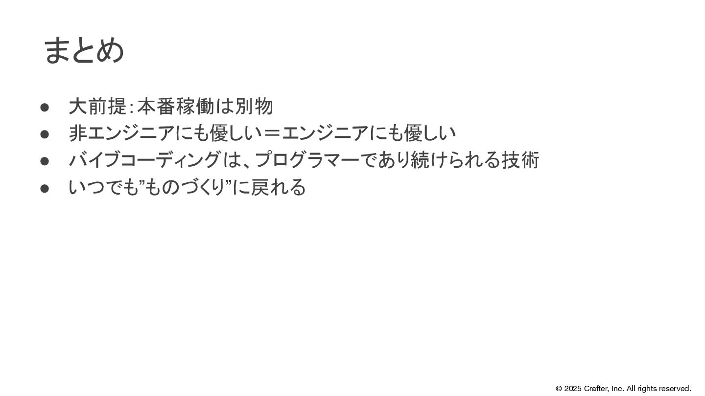 • 非エンジニアにも優しい=エンジニアにも優しい • バイブコーディングは、プログラマーであり続けられる技術 • いつでも”ものづくり”に戻れる