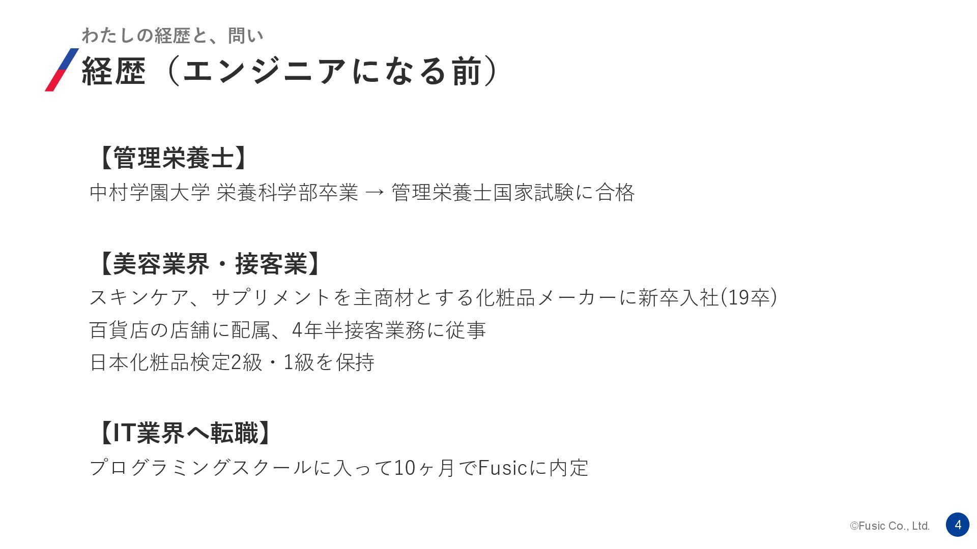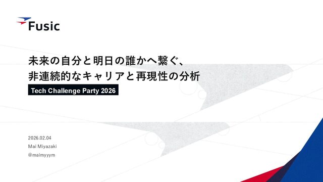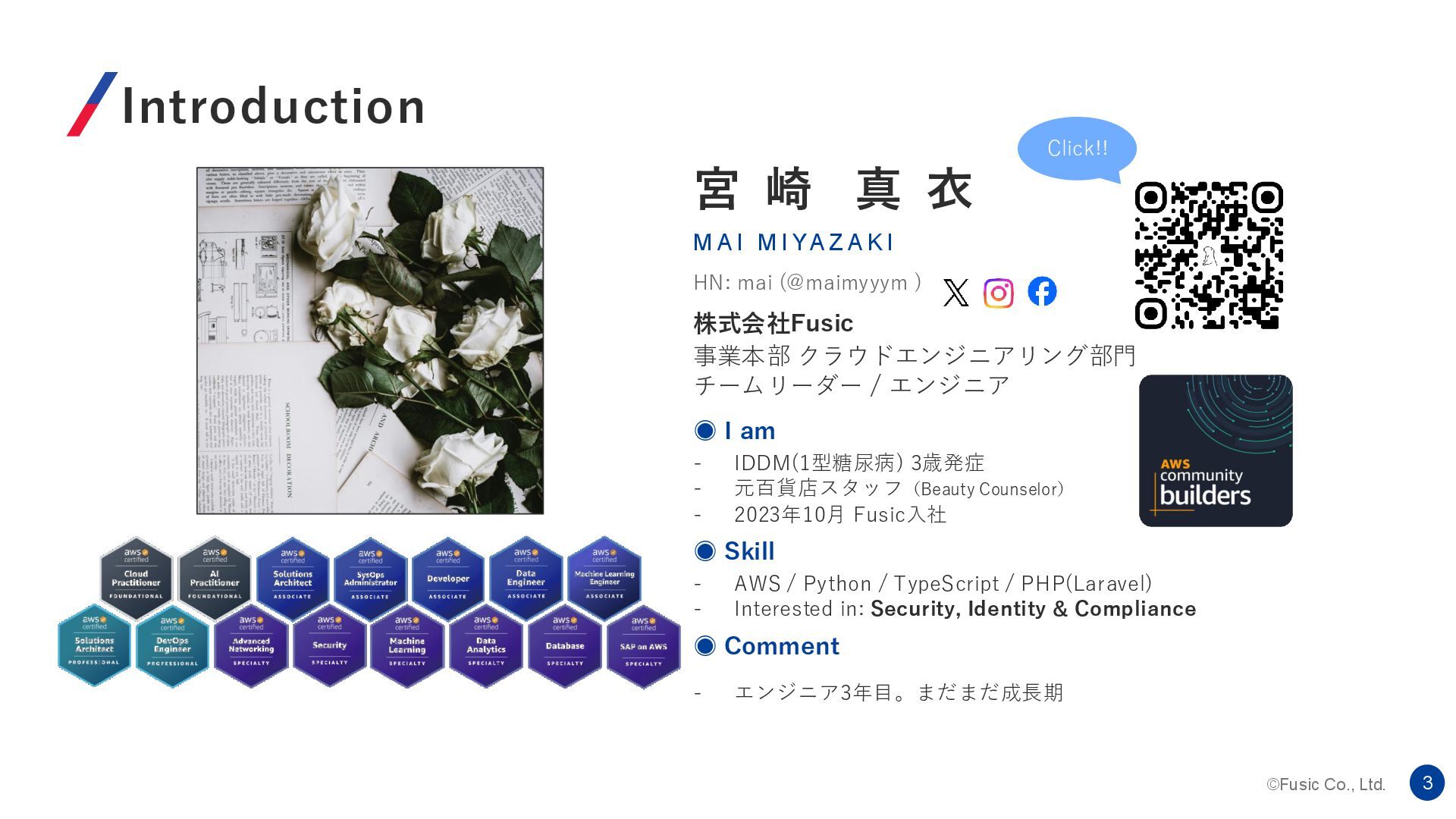 A I M I YA Z A K I HN: mai (@maimyyym ) 株式会社Fusic 事業本部 クラウドエンジニアリング部門 チームリーダー / エンジニア ◉ I am - IDDM(1型糖尿病) 3歳発症 - 元百貨店スタッフ(Beauty Counselor) - 2023年10月 Fusic入社 ◉ Skill - AWS / Python / TypeScript / PHP(Laravel) - Interested in: Security, Identity & Compliance ◉ Comment - エンジニア3年目。まだまだ成長期 Click!!