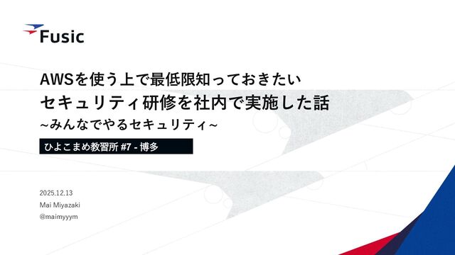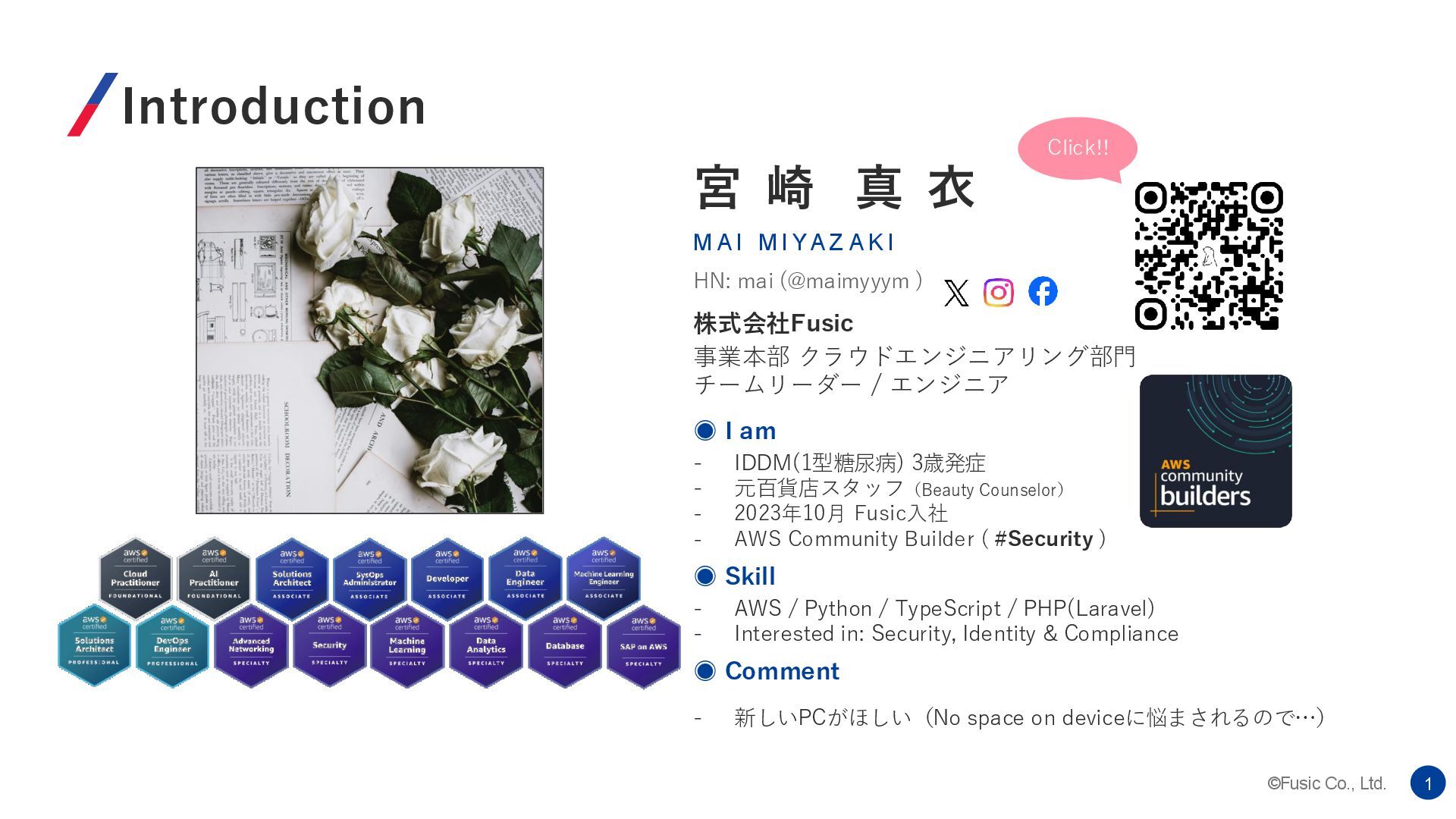 A I M I YA Z A K I HN: mai (@maimyyym ) 株式会社Fusic 事業本部 クラウドエンジニアリング部門 チームリーダー / エンジニア ◉ I am - IDDM(1型糖尿病) 3歳発症 - 元百貨店スタッフ(Beauty Counselor) - 2023年10月 Fusic入社 - AWS Community Builder ( #Security ) ◉ Skill - AWS / Python / TypeScript / PHP(Laravel) - Interested in: Security, Identity & Compliance ◉ Comment - 新しいPCがほしい(No space on deviceに悩まされるので…) Click!!