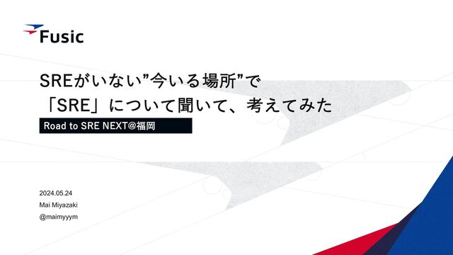 ©Fusic Co., Ltd. 1 SREがいない”今いる場所”で 「SRE」について聞いて、考えてみた 2024.05.24 Mai Miyazaki @maimyyym