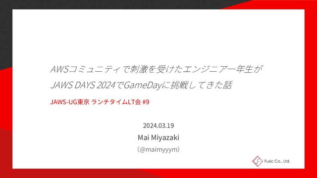 AWSコミュニティで刺激を受けたエンジニア⼀年⽣が JAWS DAYS 2024でGameDayに挑戦してきた話 JAWS-UG東京 ランチタイムLT会 #9 2024.03.19 Mai Miyazaki
