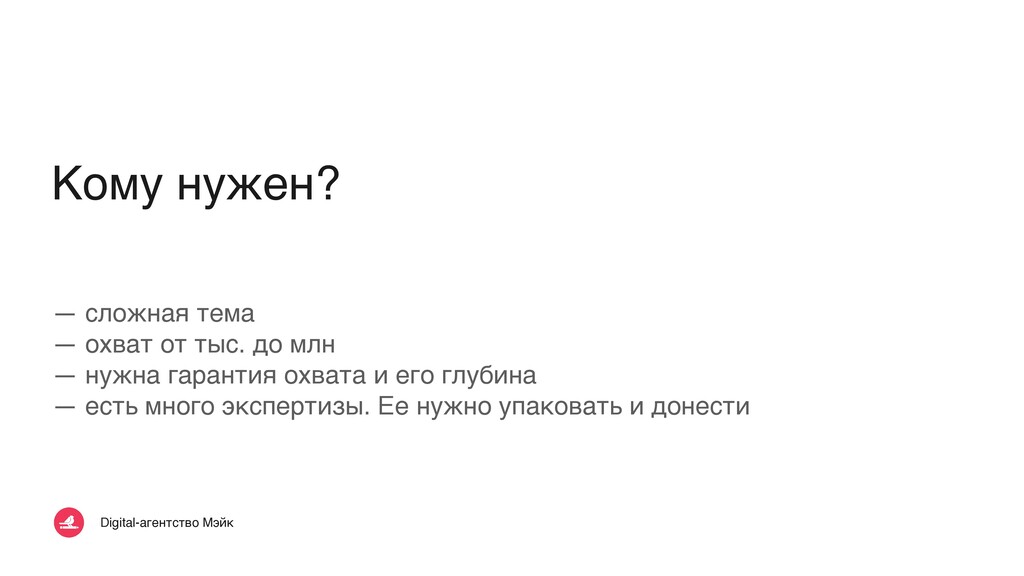 млн — нужна гарантия охвата и его глубина — есть много экспертизы. Ее нужно упаковать и донести Digital-агентство Мэйк