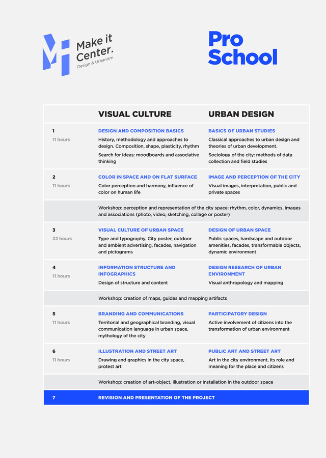 BASICS History, methodology and approaches to design. Composition, shape, plasticity, rhythm Search for ideas: moodboards and associative thinking BASICS OF URBAN STUDIES Classical approaches to urban design and theories of urban development. Sociology of the city: methods of data collection and field studies 2 11 hours COLOR IN SPACE AND ON FLAT SURFACE Color perception and harmony, influence of color on human life IMAGE AND PERCEPTION OF THE CITY Visual images, interpretation, public and private spaces Workshop: perception and representation of the city space: rhythm, color, dynamics, images and associations (photo, video, sketching, collage or poster) 3 22 hours VISUAL CULTURE OF URBAN SPACE Type and typography. City poster, outdoor and ambient advertising, facades, navigation and pictograms DESIGN OF URBAN SPACE Public spaces, hardscape and outdoor amenities, facades, transformable objects, dynamic environment 4 11 hours INFORMATION STRUCTURE AND INFOGRAPHICS Design of structure and content DESIGN RESEARCH OF URBAN ENVIRONMENT Visual anthropology and mapping Workshop: creation of maps, guides and mapping artifacts 5 11 hours BRANDING AND COMMUNICATIONS Territorial and geographical branding, visual communication language in urban space, mythology of the city PARTICIPATORY DESIGN Active involvement of citizens into the transformation of urban environment 6 11 hours ILLUSTRATION AND STREET ART Drawing and graphics in the city space, protest art PUBLIC ART AND STREET ART Art in the city environment, its role and meaning for the place and citizens Workshop: creation of art-object, illustration or installation in the outdoor space 7 REVISION AND PRESENTATION OF THE PROJECT Pro School