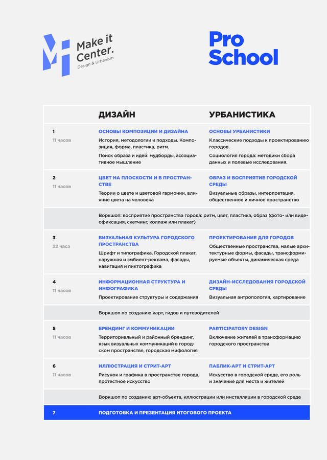 методологии и подходы. Компо- зиция, форма, пластика, ритм. Поиск образа и идей: мудборды, ассоциа- тивное мышление ОСНОВЫ УРБАНИСТИКИ Классические подходы к проектированию городов. Социология города: методики сбора данных и полевые исследования. 2 11 часов ЦВЕТ НА ПЛОСКОСТИ И В ПРОСТРАН- СТВЕ Теории о цвете и цветовой гармонии, вли- яние цвета на человека ОБРАЗ И ВОСПРИЯТИЕ ГОРОДСКОЙ СРЕДЫ Визуальные образы, интерпретация, общественное и личное пространство Воркшоп: восприятие пространства города: ритм, цвет, пластика, образ (фото- или виде- офиксация, скетчинг, коллаж или плакат) 3 22 часа ВИЗУАЛЬНАЯ КУЛЬТУРА ГОРОДСКОГО ПРОСТРАНСТВА Шрифт и типографика. Городской плакат, наружная и эмбиент-реклама, фасады, навигация и пиктографика ПРОЕКТИРОВАНИЕ ДЛЯ ГОРОДОВ Общественные пространства, малые архи- тектурные формы, фасады, трансформи- руемые объекты, динамическая среда 4 11 часов ИНФОРМАЦИОННАЯ СТРУКТУРА И ИНФОГРАФИКА Проектирование структуры и содержания ДИЗАЙН-ИССЛЕДОВАНИЯ ГОРОДСКОЙ СРЕДЫ Визуальная антропология, картирование Воркшоп по созданию карт, гидов и путеводителей 5 11 часов БРЕНДИНГ И КОММУНИКАЦИИ Территориальный и районный брендинг, язык визуальных коммуникаций в город- ском пространстве, городская мифология PARTICIPATORY DESIGN Включение жителей в трансформацию городского пространства 6 11 часов ИЛЛЮСТРАЦИЯ И СТРИТ-АРТ Рисунок и графика в пространстве города, протестное искусство ПАБЛИК-АРТ И СТРИТ-АРТ Искусство в городской среде, его роль и значение для места и жителей Воркшоп по созданию арт-объекта, иллюстрации или инсталляции в городской среде 7 ПОДГОТОВКА И ПРЕЗЕНТАЦИЯ ИТОГОВОГО ПРОЕКТА Pro School