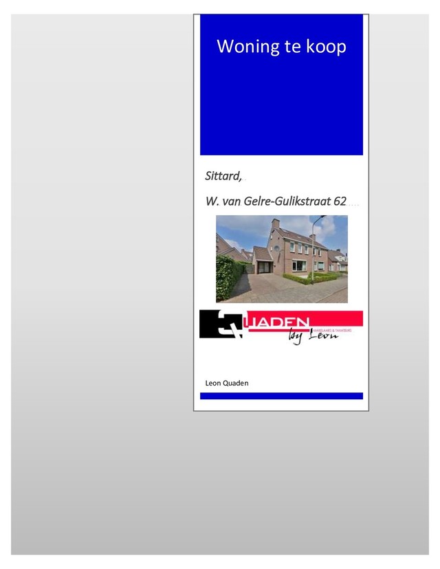 ons voor een gratis 1e hypotheekgesprek. Wij hopen je middels deze woningpresentatie voldoende geïnformeerd te hebben om een goede eerste indruk te krijgen van het object. Mocht je vragen hebben of kunnen we je ergens mee helpen? Bel ons dan op 046-30 200 30 of mail naar [email protected] Wij kunnen je dan helpen op de manier die jij wilt. Een taxateur, aankoopmakelaar of erkend hypotheekadviseur staan direct tot je beschikking. Zo bent je altijd goed voorbereid. Vragen kost niets. Bel gerust, we bijten niet. Maak je uiteindelijk gebruik van een dienst dan kan dit altijd tegen een scherpe prijs. Het Team van Quaden Makelaars Leon Quaden, Ron Hameleers, Ron Paulussen, Lilian Notten en Peggy Hermans. DISCLAIMER. Deze informatie is door ons met de nodige zorgvuldigheid samengesteld. Onzerzijds wordt echter geen enkele aansprakelijkheid aanvaard voor enige onvolledigheid, onjuistheid of anderszins, dan wel de gevolgen daarvan. Alle opgegeven maten en oppervlakten zijn indicatief.