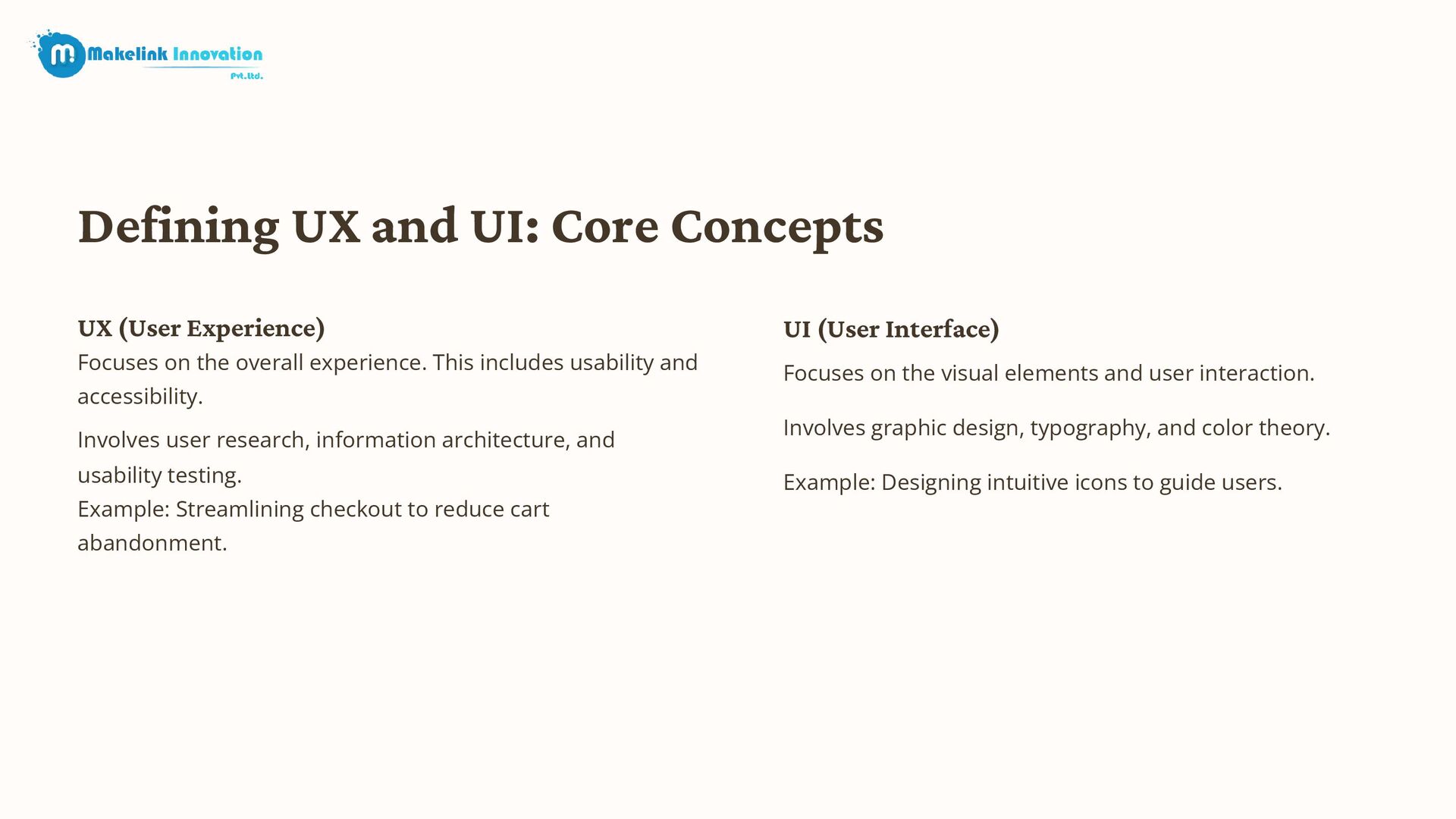 on the overall experience. This includes usability and accessibility. Involves user research, information architecture, and usability testing. Example: Streamlining checkout to reduce cart abandonment. UI (User Interface) Focuses on the visual elements and user interaction. Involves graphic design, typography, and color theory. Example: Designing intuitive icons to guide users.
