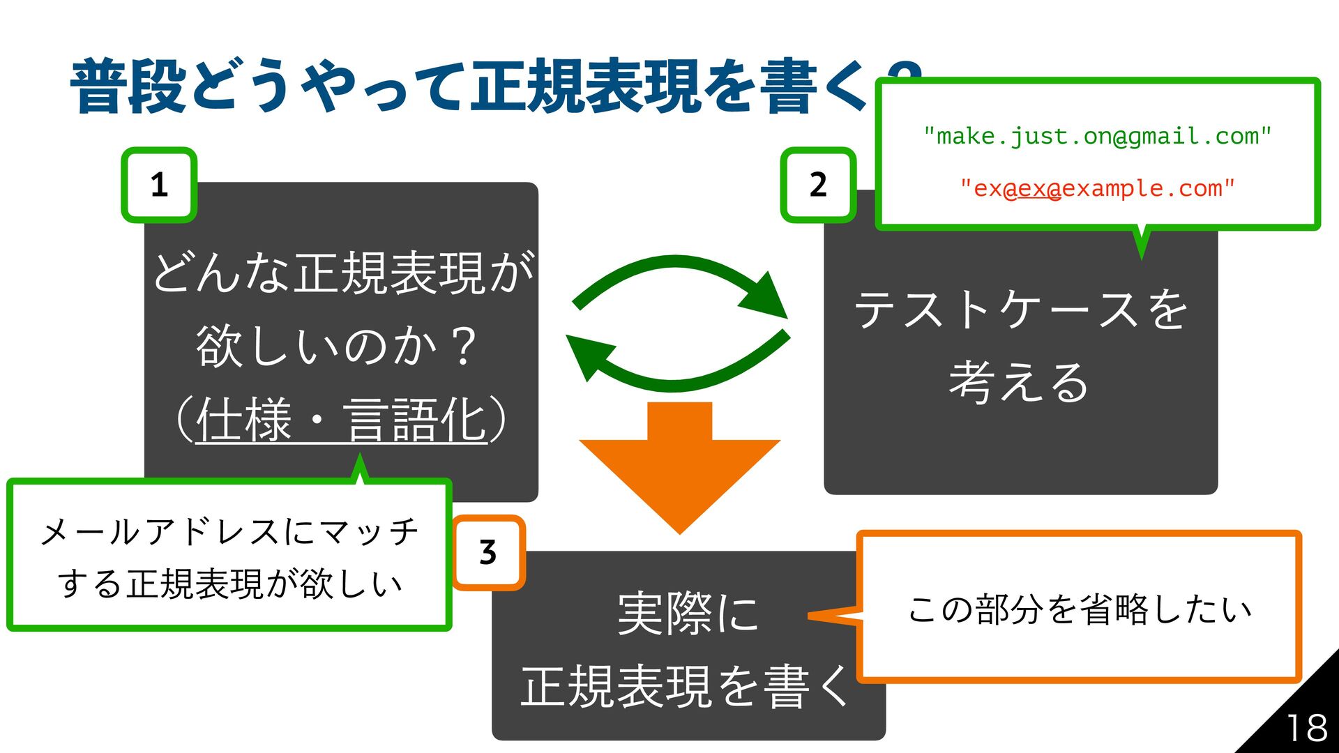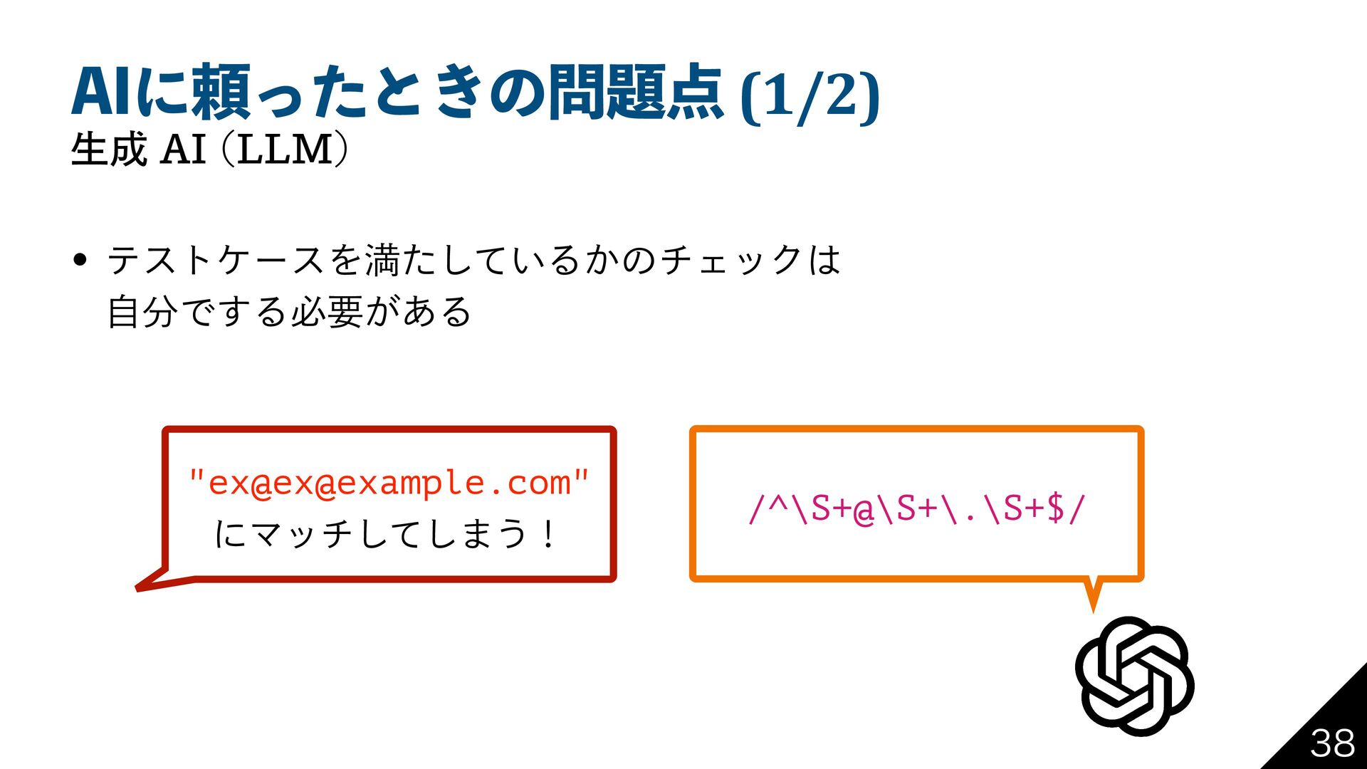"*ʹཔͬͨͱ͖ͷ (1/2) ੜ"* --. w ςετέʔεΛຬ͍ͨͯ͠Δ͔ͷνΣοΫ ࣗͰ͢Δඞཁ͕͋Δ /^\S+@\S+\.\S+$/ "ex@