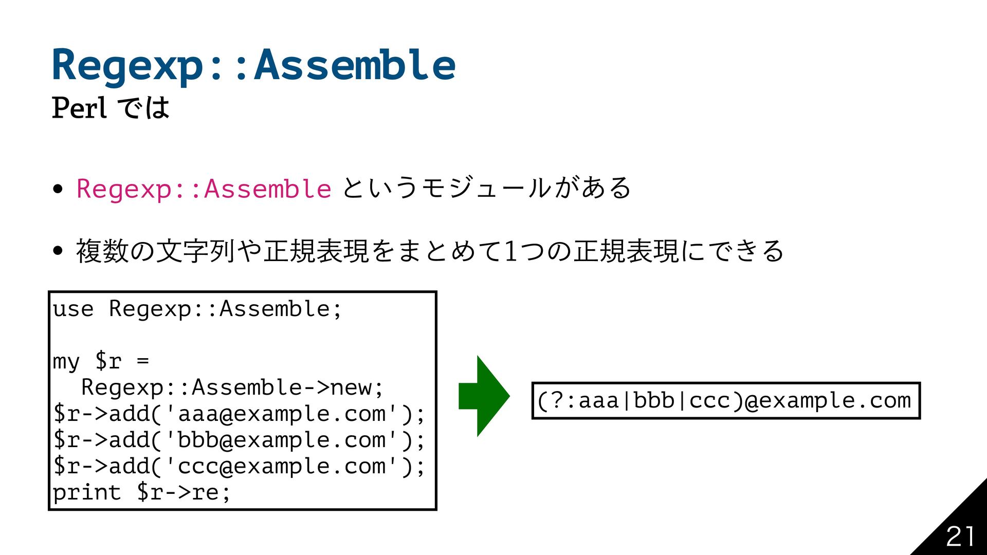 Regexp::Assemble 1FSMͰ w Regexp::Assembleͱ͍͏Ϟδϡʔϧ͕͋Δ w ෳͷจࣈྻਖ਼نදݱΛ·ͱΊͯͭͷਖ਼نදݱʹͰ͖Δ use Regexp::Assemble; my