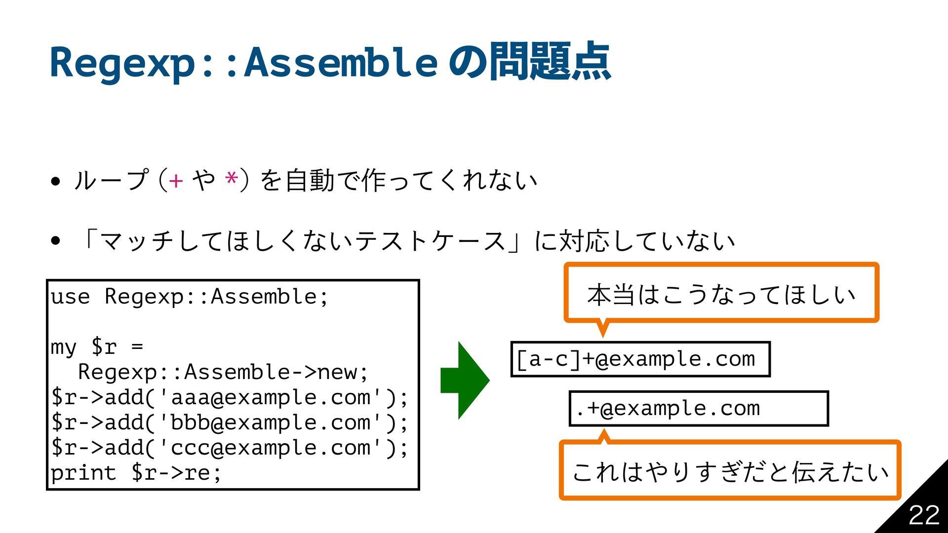 Regexp::Assembleͷ w ϧʔϓ +* ΛࣗಈͰ࡞ͬͯ͘Εͳ͍ w ʮϚονͯ͠΄͘͠ͳ͍ςετέʔεʯʹରԠ͍ͯ͠ͳ͍ use Regexp::Assemble;