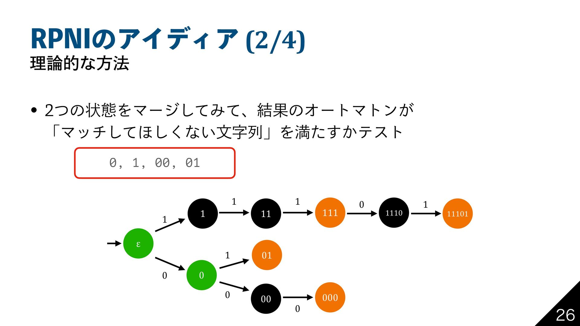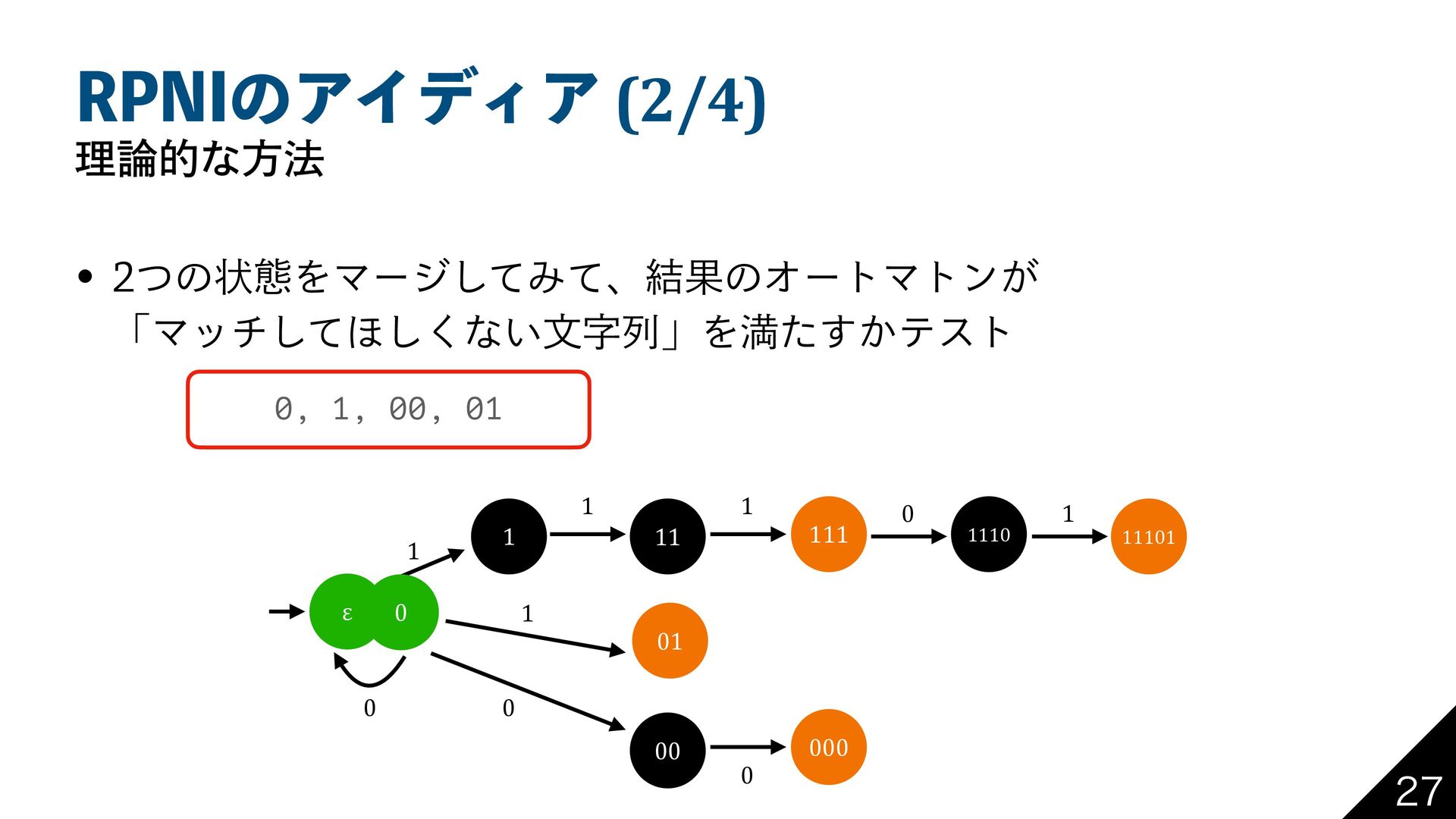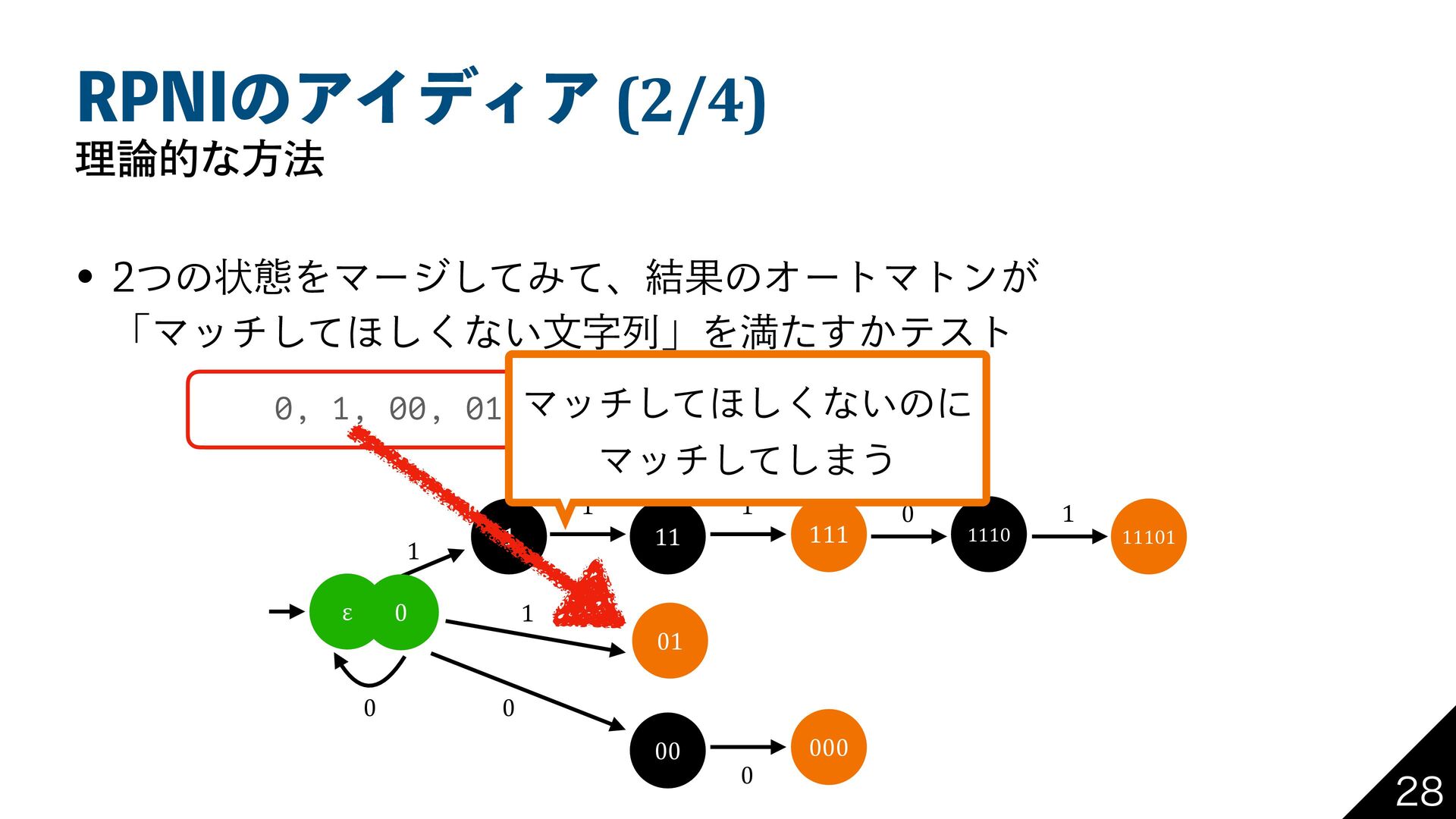 31/*ͷΞΠσΟΞ (2/4) ཧతͳํ๏ w ͭͷঢ়ଶΛϚʔδͯ͠Έͯɺ݁ՌͷΦʔτϚτϯ͕ ʮϚονͯ͠΄͘͠ͳ͍จࣈྻʯΛຬ͔ͨ͢ςετ ε 1 1