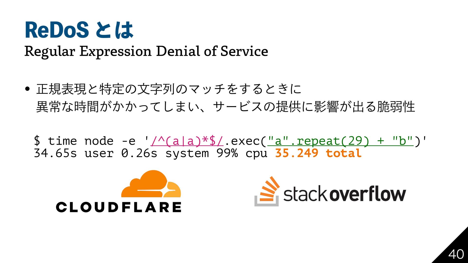 3F%P4ͱ 3FHVMBS&YQSFTTJPO%FOJBMPG4FSWJDF w ਖ਼نදݱͱಛఆͷจࣈྻͷϚονΛ͢Δͱ͖ʹ ҟৗͳ͕͔͔࣌ؒͬͯ͠·͍ɺαʔϏεͷఏڙʹӨڹ͕ग़Δ੬ऑੑ $ time node -e