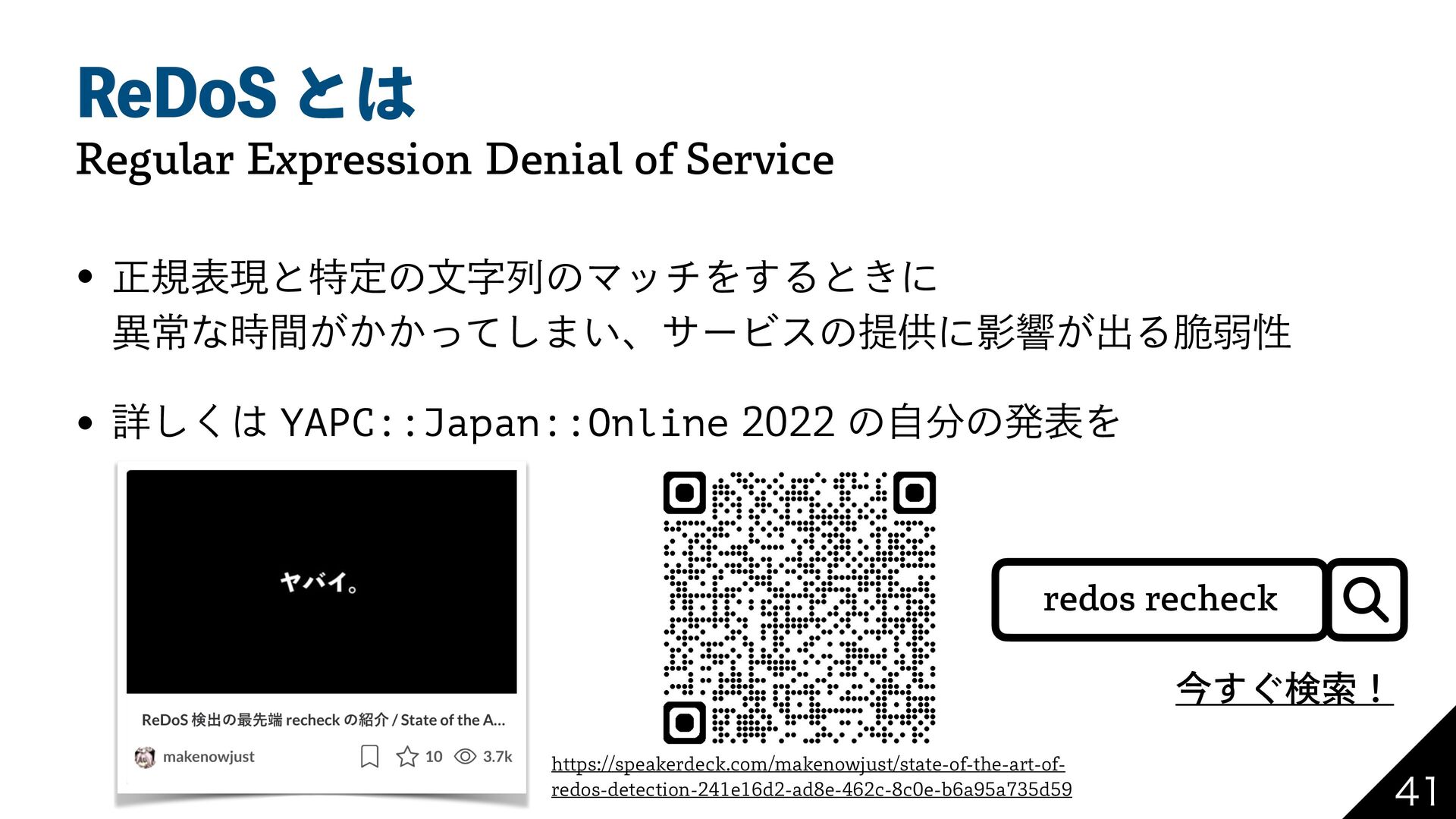 3F%P4ͱ 3FHVMBS&YQSFTTJPO%FOJBMPG4FSWJDF w ਖ਼نදݱͱಛఆͷจࣈྻͷϚονΛ͢Δͱ͖ʹ ҟৗͳ͕͔͔࣌ؒͬͯ͠·͍ɺαʔϏεͷఏڙʹӨڹ͕ग़Δ੬ऑੑ w ৄ͘͠YAPC::Japan::OnlineͷࣗͷൃදΛ IUUQTTQFBLFSEFDLDPNNBLFOPXKVTUTUBUFPGUIFBSUPG SFEPTEFUFDUJPOFEBEFDDFCBBE