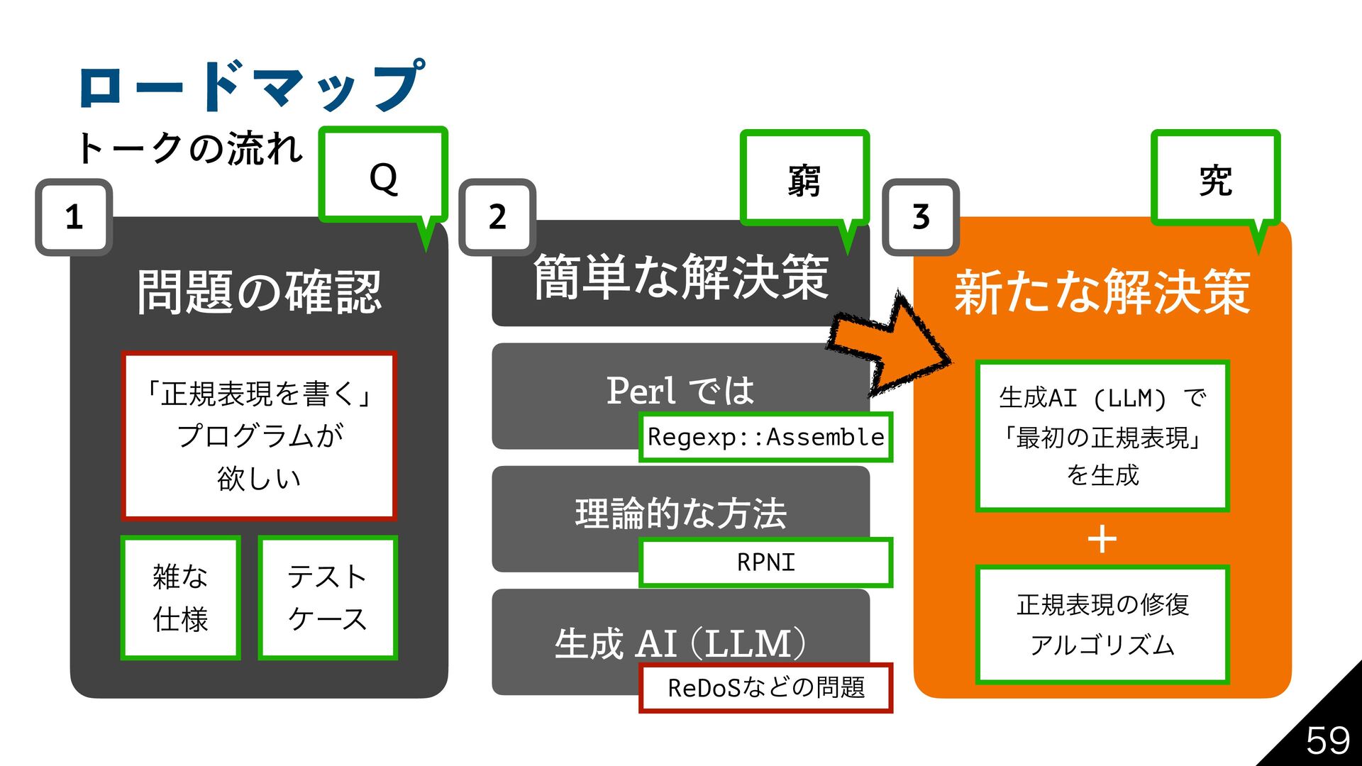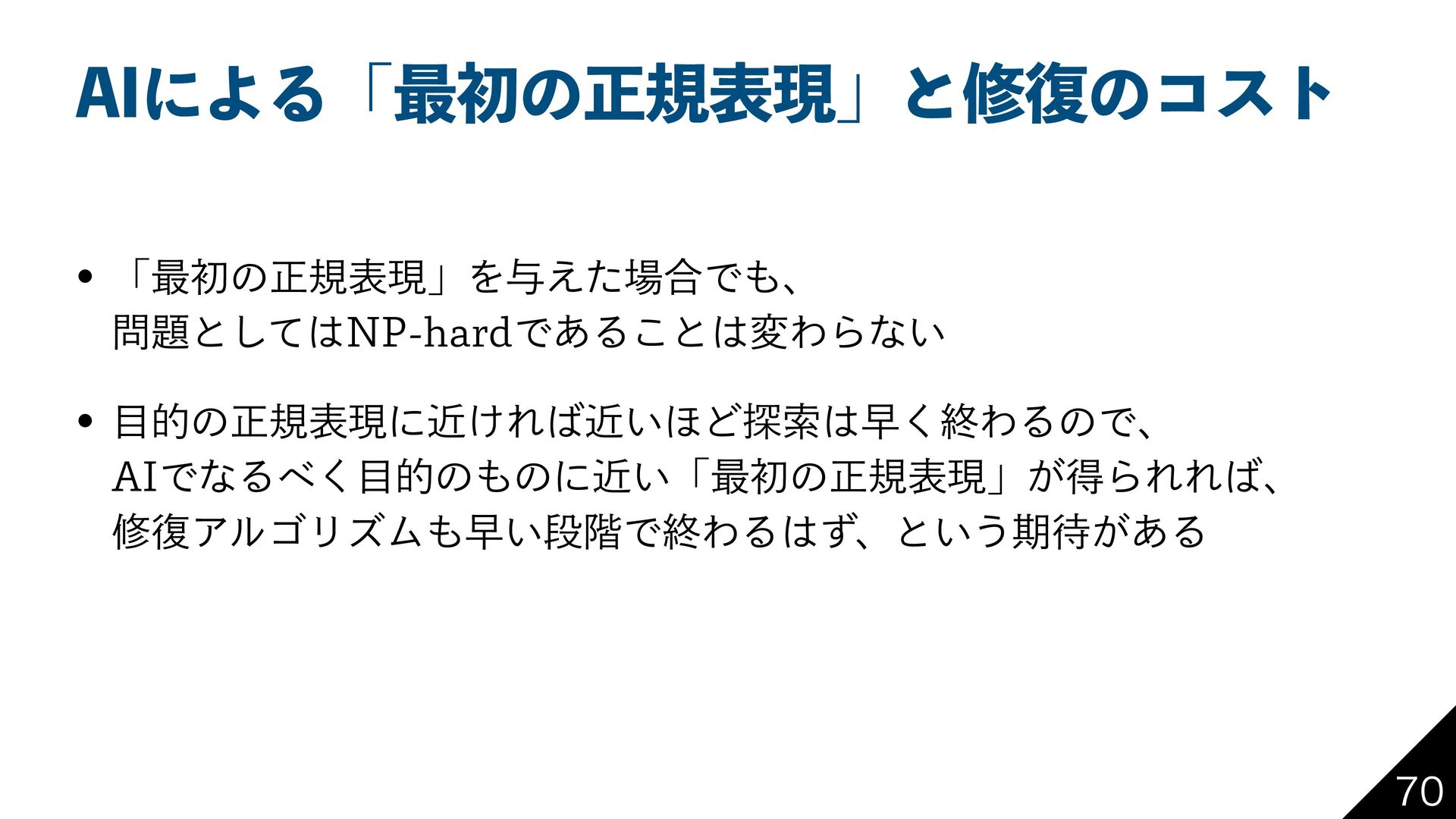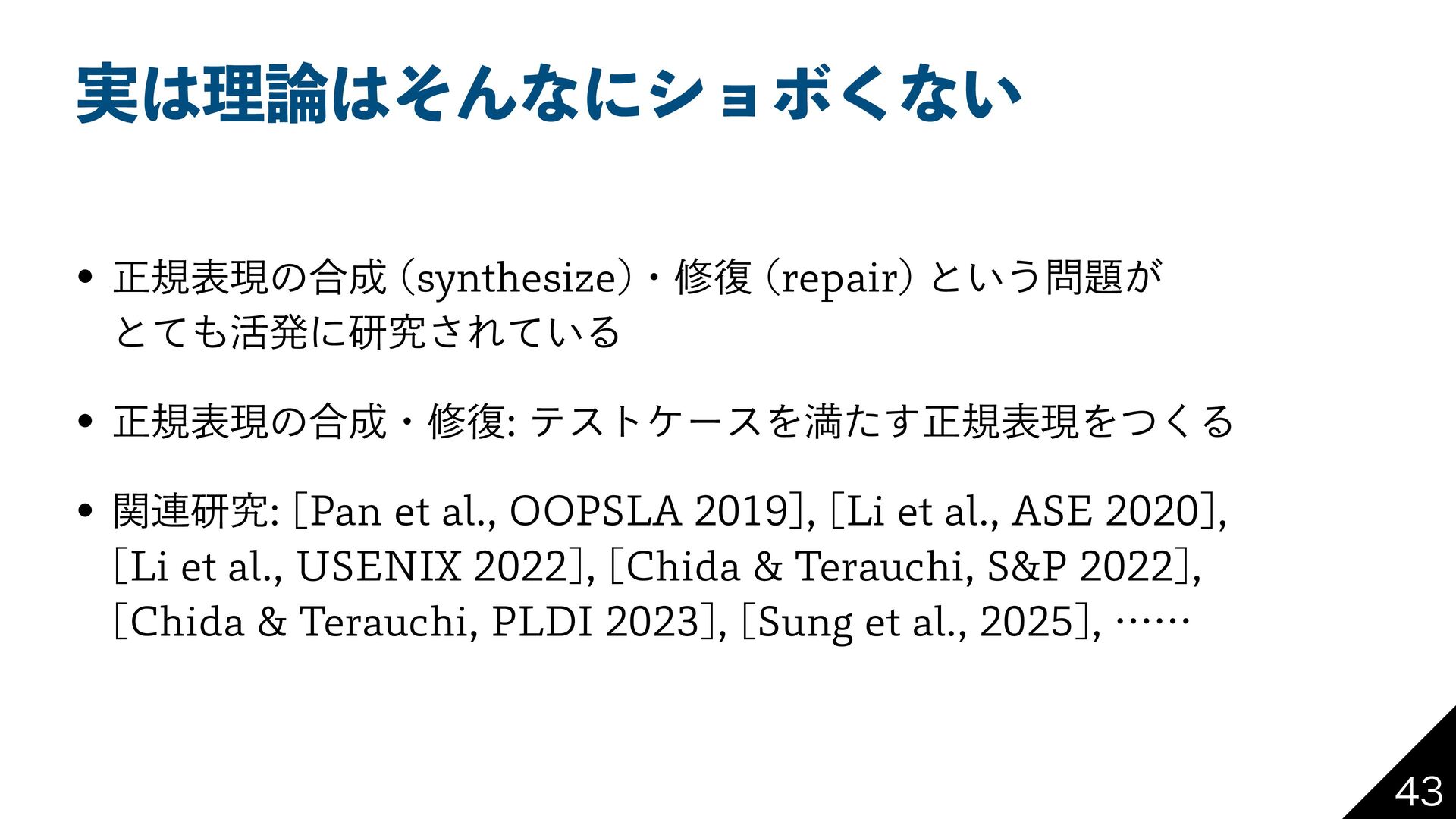 1FSMͰ ؆୯ͳղܾࡦ Regexp::Assemble RPNI ReDoSͳͲͷ 2 ʮਖ਼نදݱΛॻ͘ʯ ϓϩάϥϜ͕ ཉ͍͠ ࡶͳ ༷ ςετ έʔε ੜAI (LLM) Ͱ ʮ࠷ॳͷਖ਼نදݱʯ Λੜ ਖ਼نදݱͷम෮ ΞϧΰϦζϜ ځ 2 ڀ