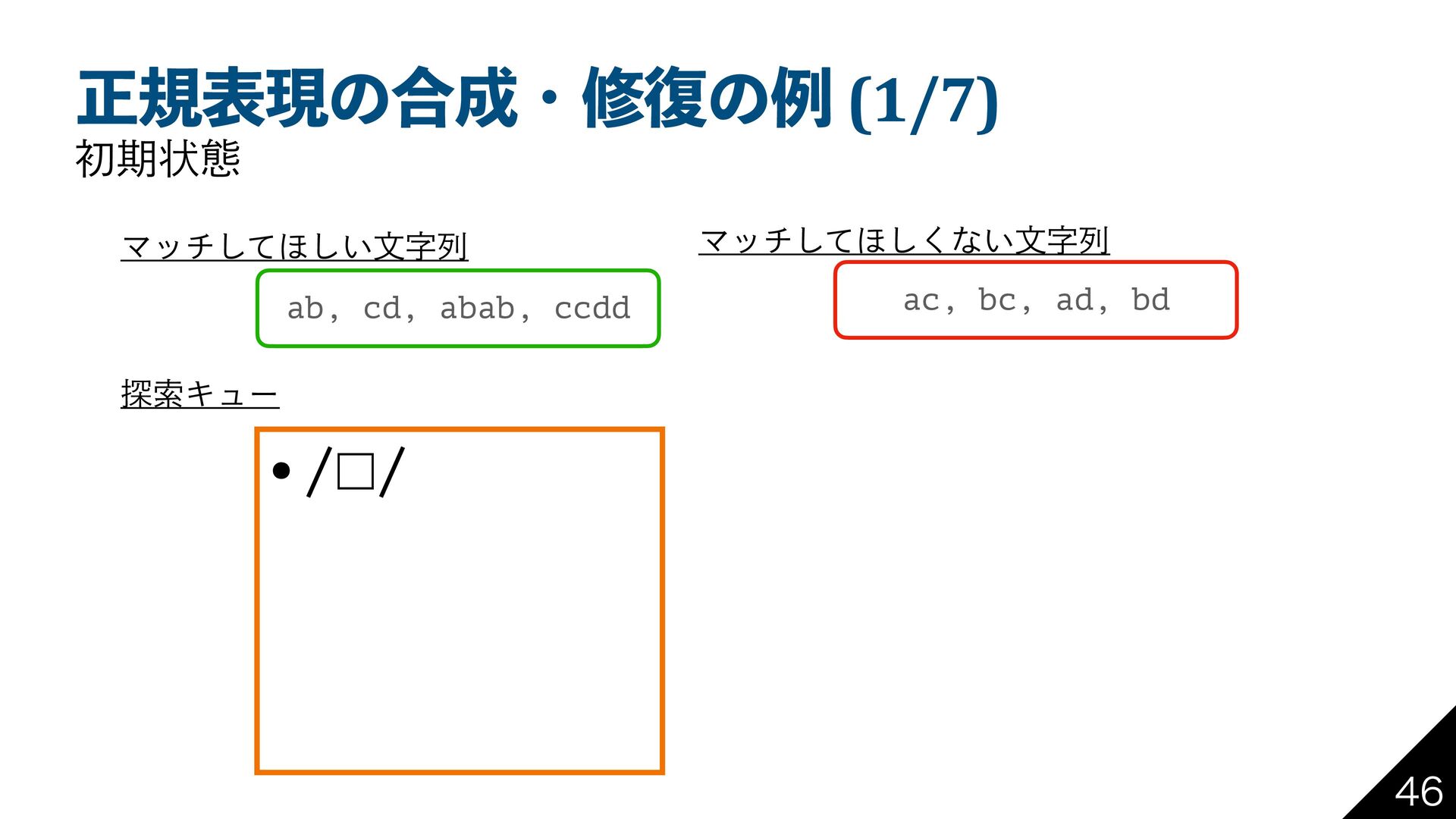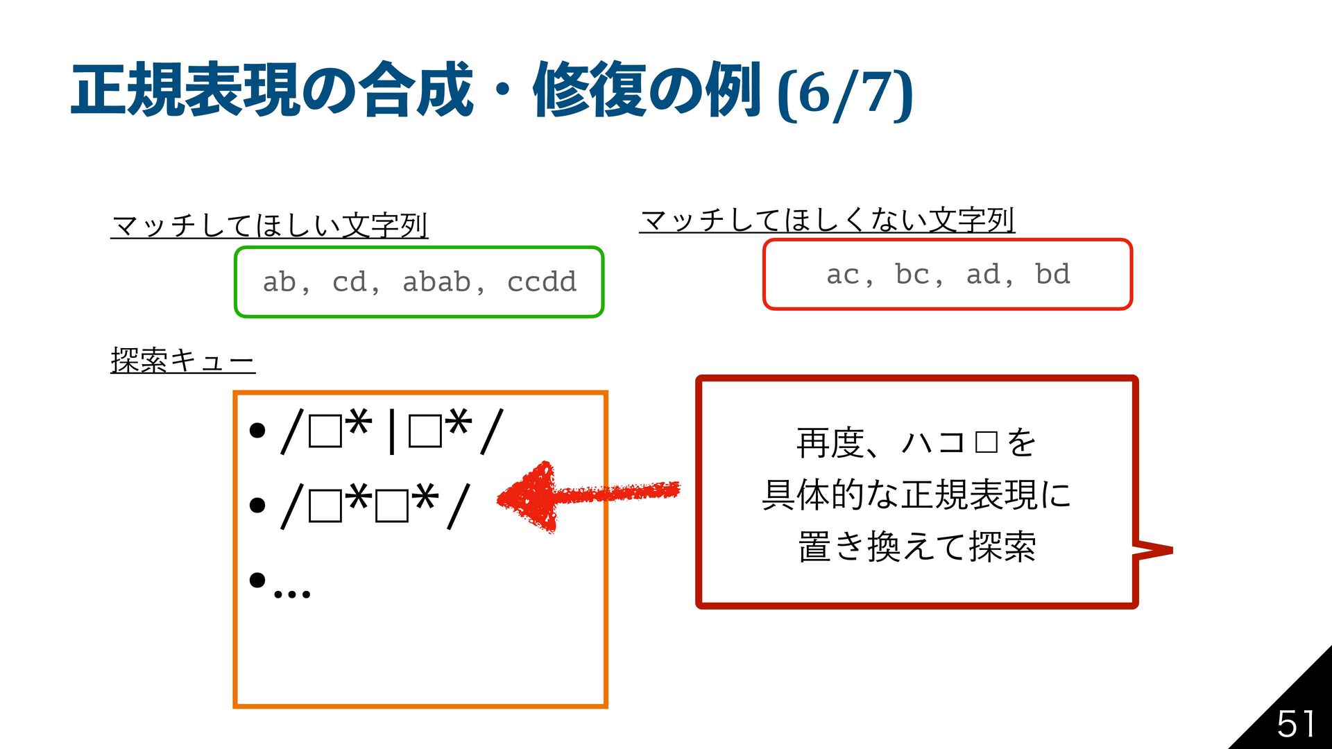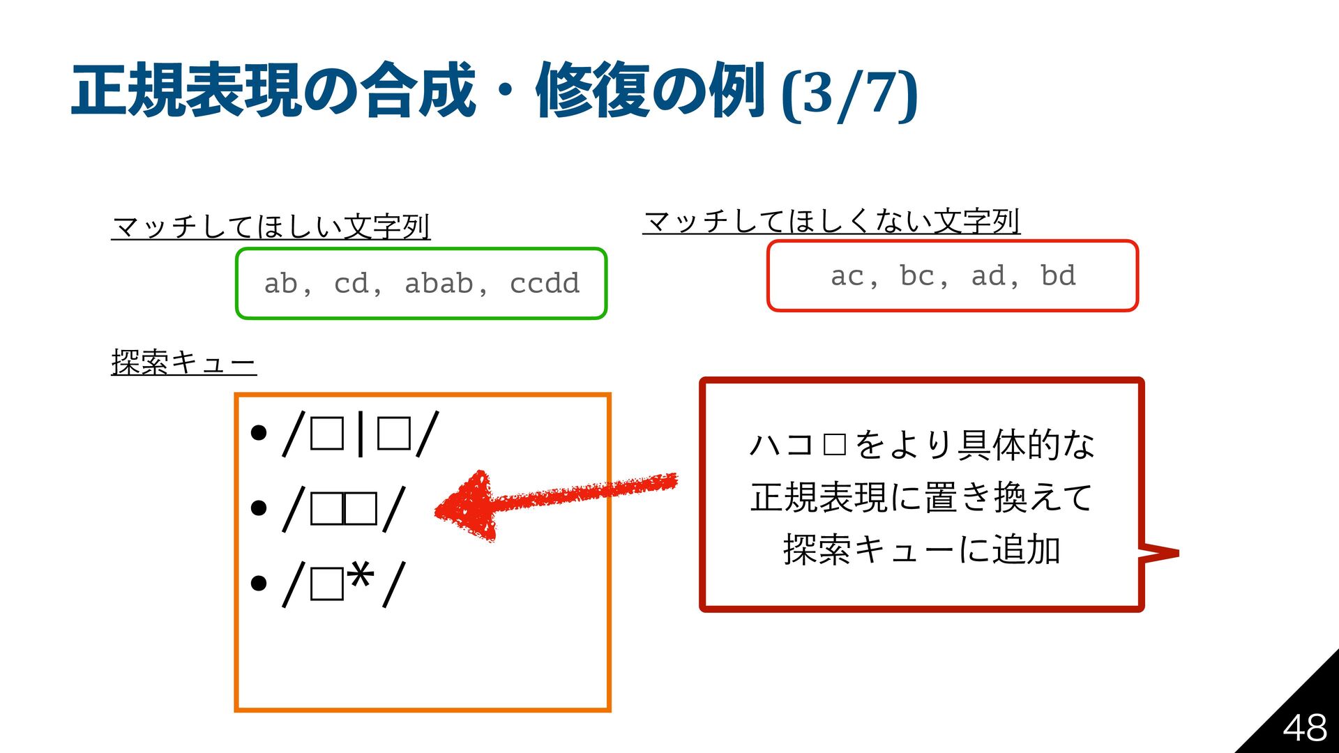 bd Ϛονͯ͠΄͍͠จࣈྻ Ϛονͯ͠΄͘͠ͳ͍จࣈྻ ୳ࡧΩϡʔ •/□|□/ •/□□/ •/□*/ ϋί˘ΛΑΓ۩ମతͳ ਖ਼نදݱʹஔ͖͑ͯ ୳ࡧΩϡʔʹՃ