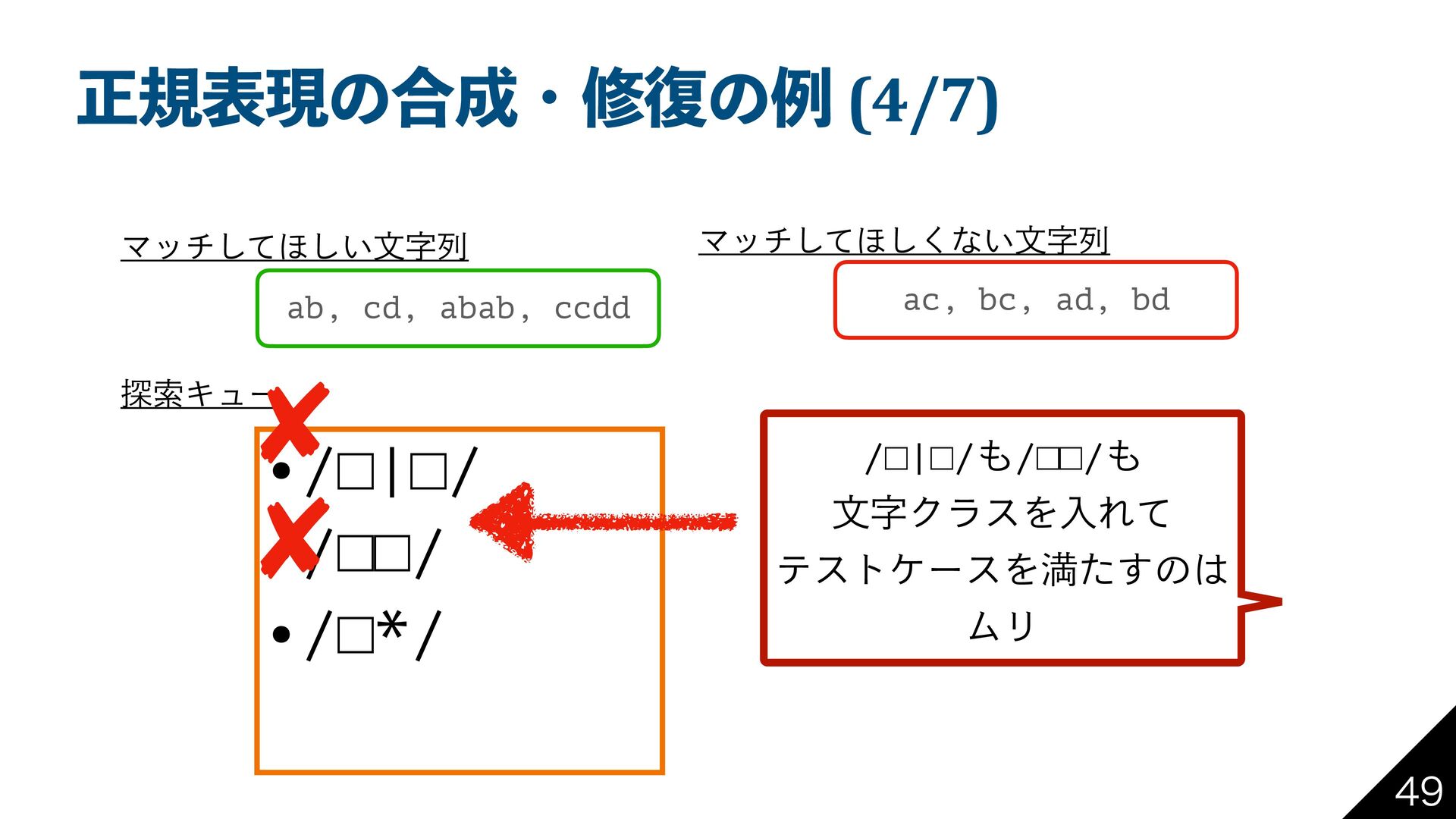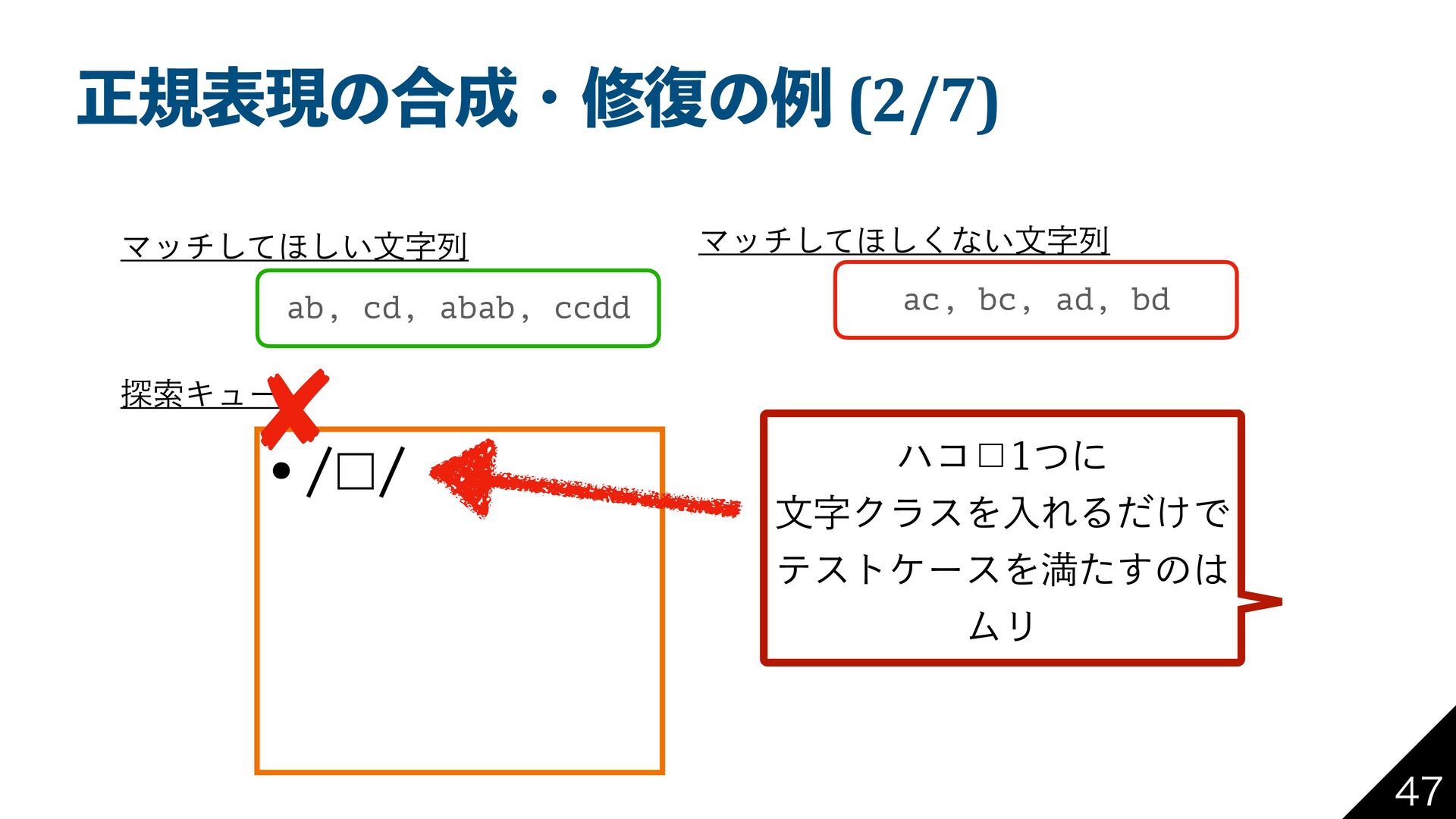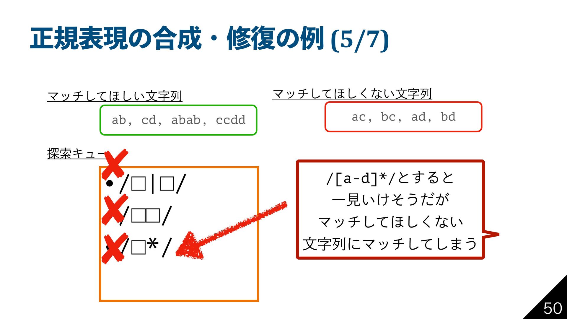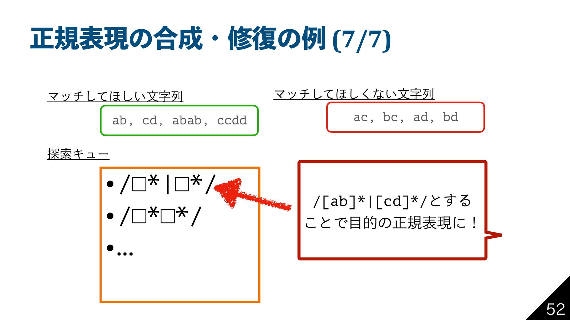 bd Ϛονͯ͠΄͍͠จࣈྻ Ϛονͯ͠΄͘͠ͳ͍จࣈྻ ୳ࡧΩϡʔ •/□*|□*/ •/□*□*/ •… /[ab]*|[cd]*/ͱ͢Δ ͜ͱͰతͷਖ਼نදݱʹʂ