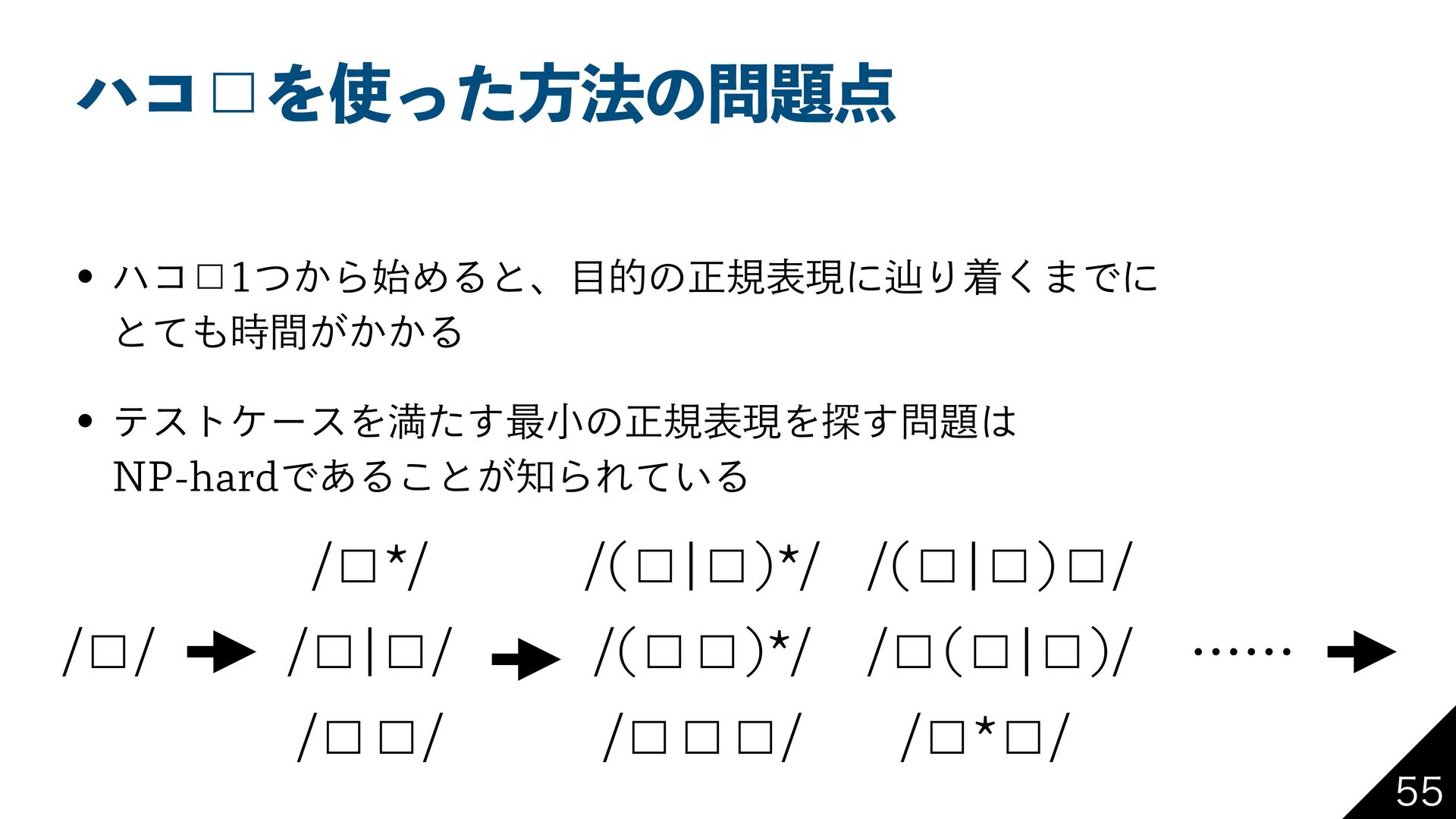 ϋί˘Λͬͨํ๏ͷ w ϋί˘͔ͭΒ࢝ΊΔͱɺతͷਖ਼نදݱʹḷΓண͘·Ͱʹ ͱ͕͔͔ͯ࣌ؒΔ w ςετέʔεΛຬͨ͢࠷খͷਖ਼نදݱΛ୳͢ /1IBSEͰ͋Δ͜ͱ͕ΒΕ͍ͯΔ ˘ ˘
