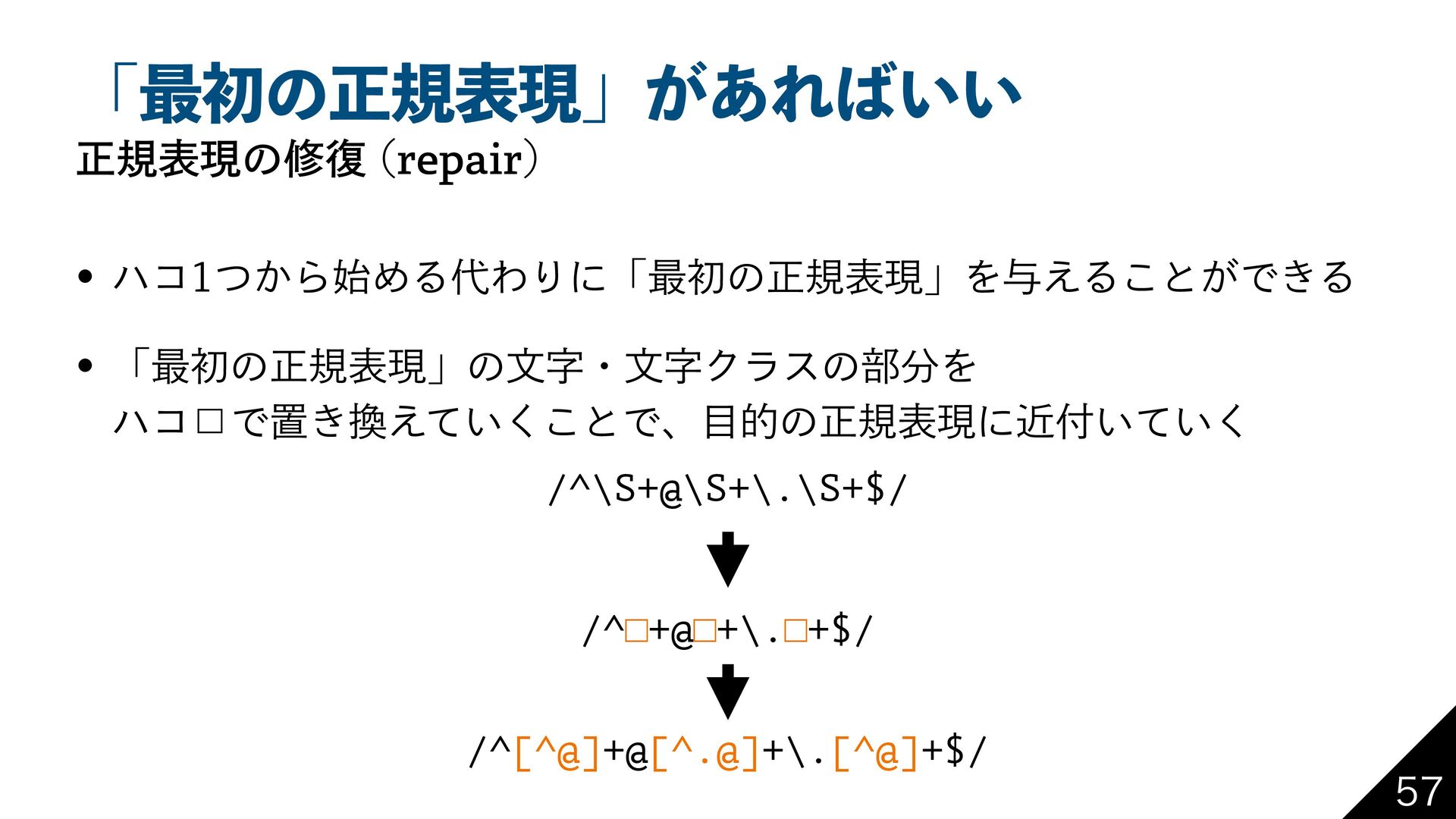 ʮ࠷ॳͷਖ਼نදݱʯ͕͋Ε͍͍ ਖ਼نදݱͷम෮ SFQBJS w ϋί͔ͭΒ࢝ΊΔΘΓʹʮ࠷ॳͷਖ਼نදݱʯΛ༩͑Δ͜ͱ͕Ͱ͖Δ w ʮ࠷ॳͷਖ਼نදݱʯͷจࣈɾจࣈΫϥεͷ෦Λ ϋί˘Ͱஔ͖͍͑ͯ͘͜ͱͰɺతͷਖ਼نදݱʹ͍͍ۙͯ͘ /^\S+@\S+\.\S+$/