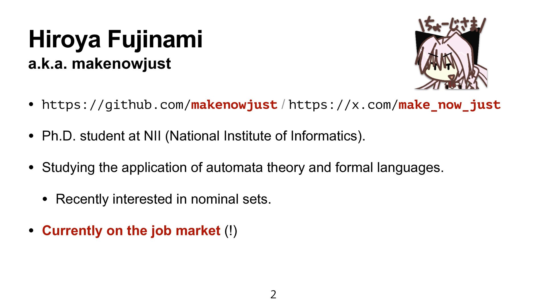 student at NII (National Institute of Informatics). • Studying the application of automata theory and formal languages. • Recently interested in nominal sets. • Currently on the job market (!) 2