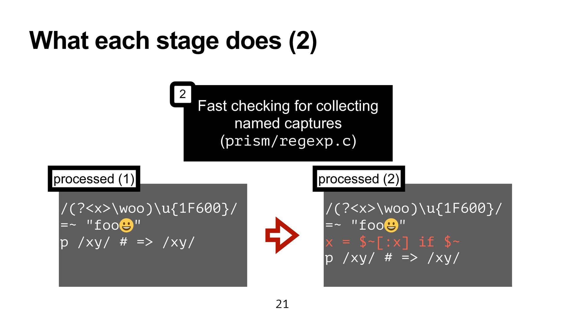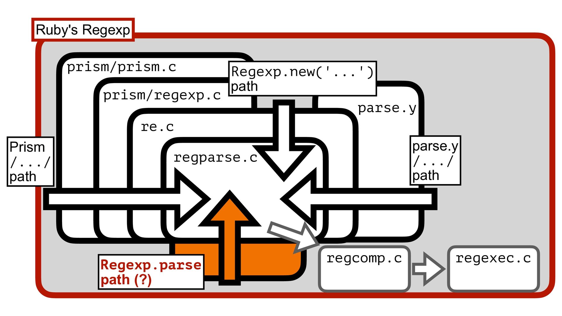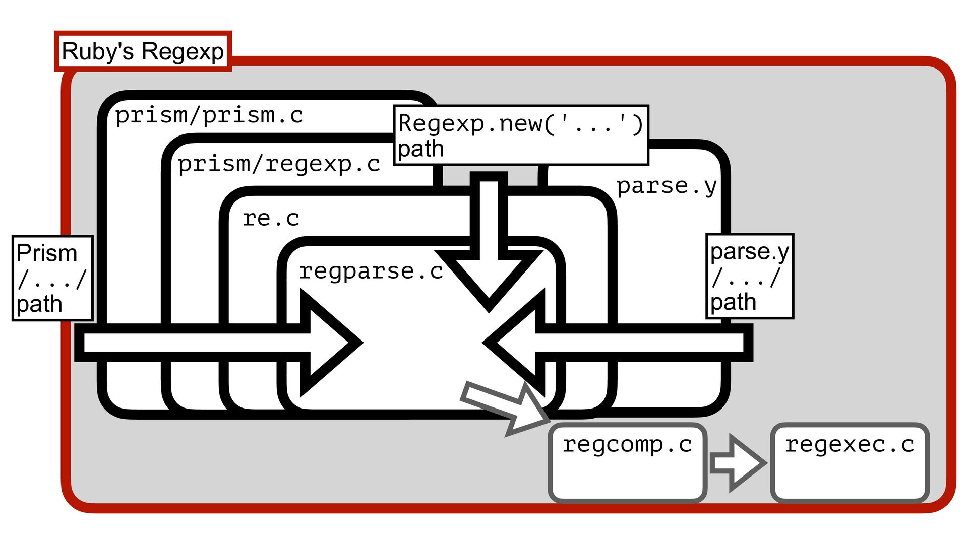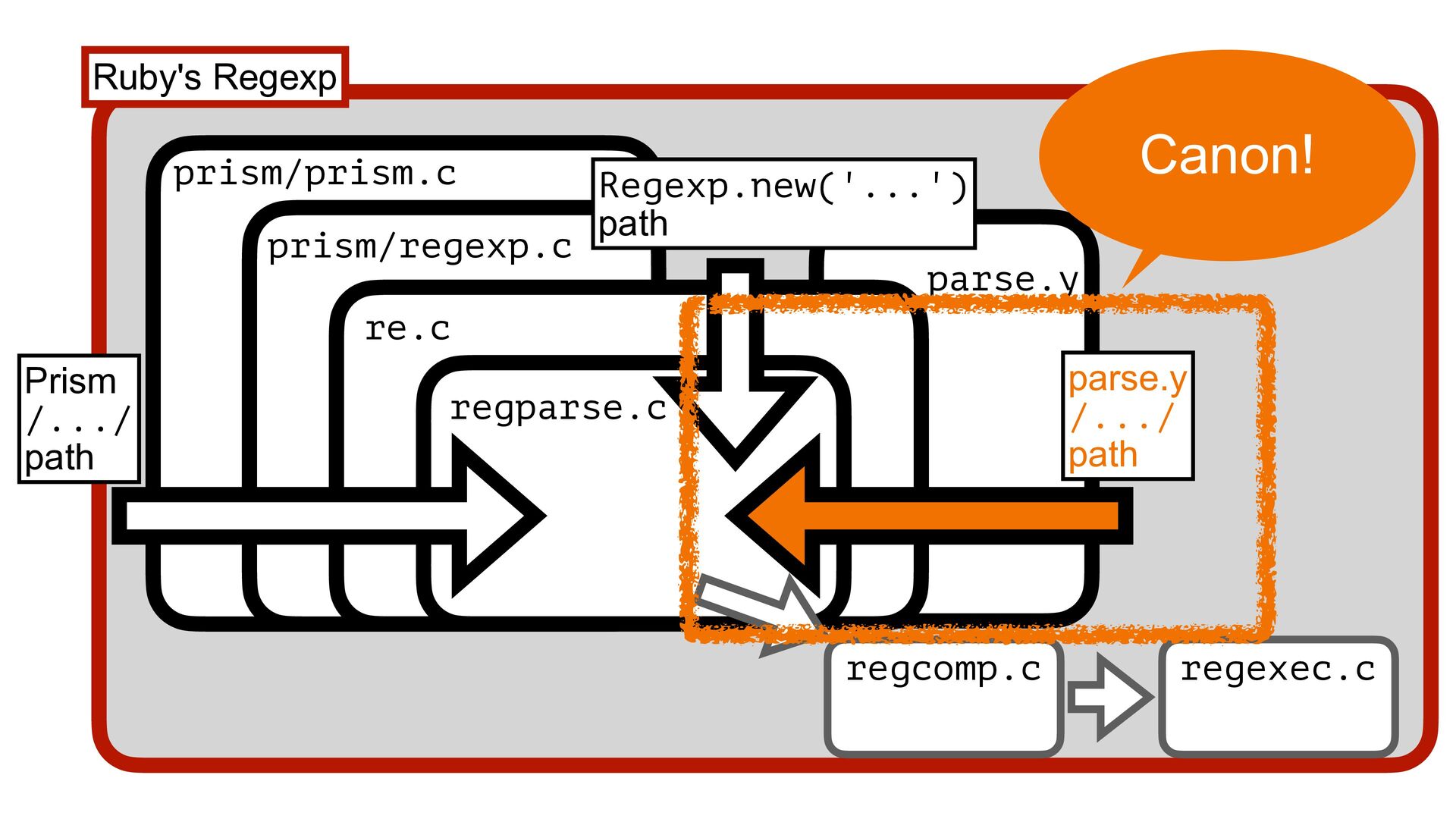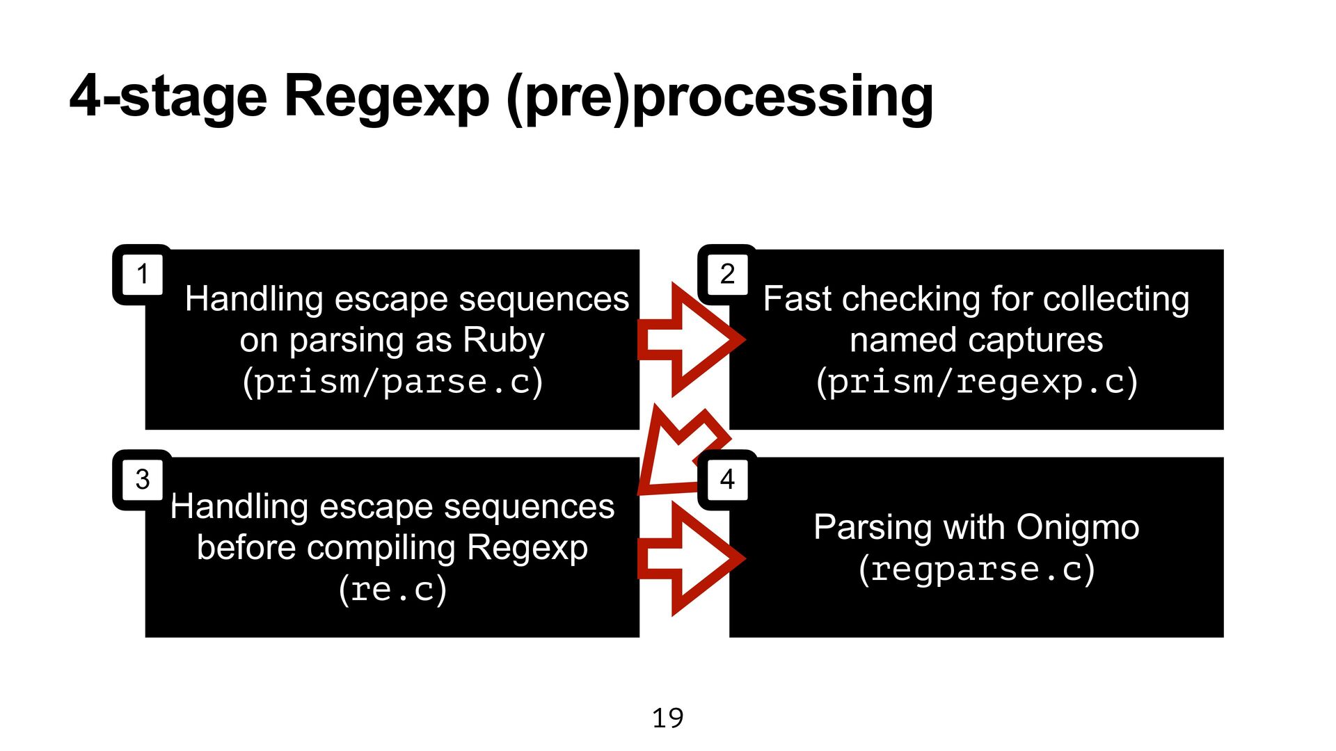Ruby (prism/parse.c) Handling escape sequences before compiling Regexp (re.c) Fast checking for collecting named captures (prism/regexp.c) Parsing with Onigmo (regparse.c) 1 2 3 4