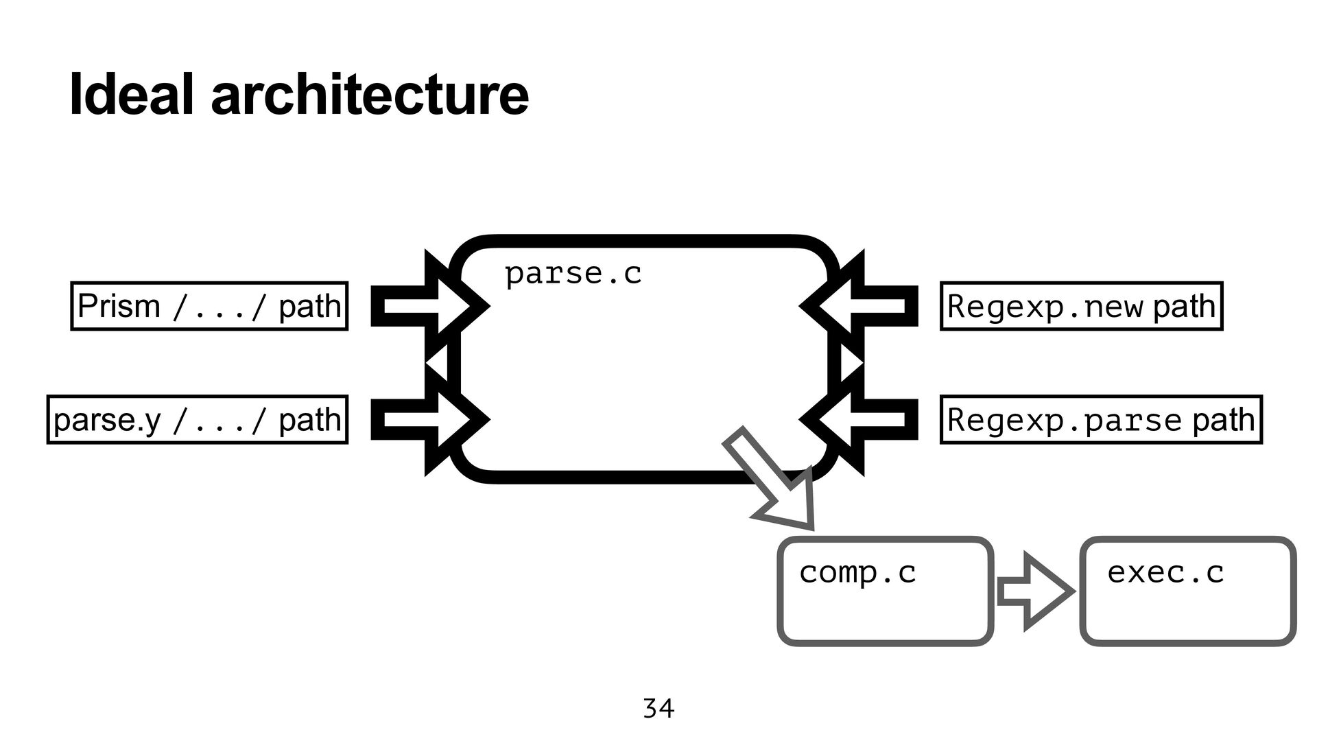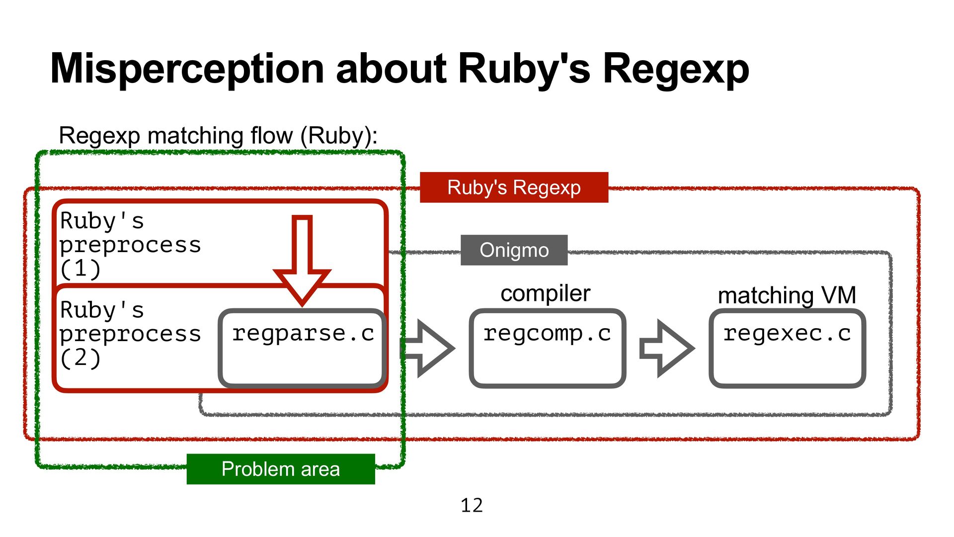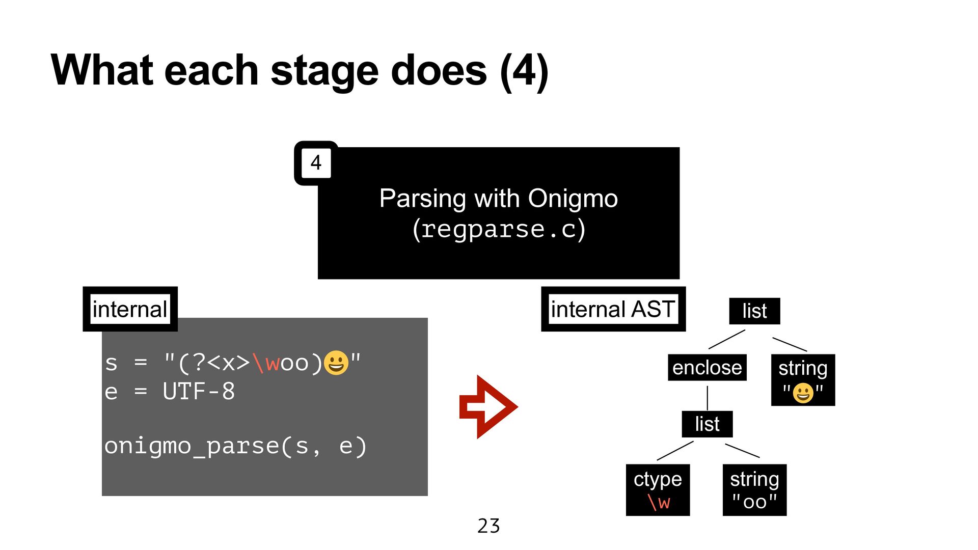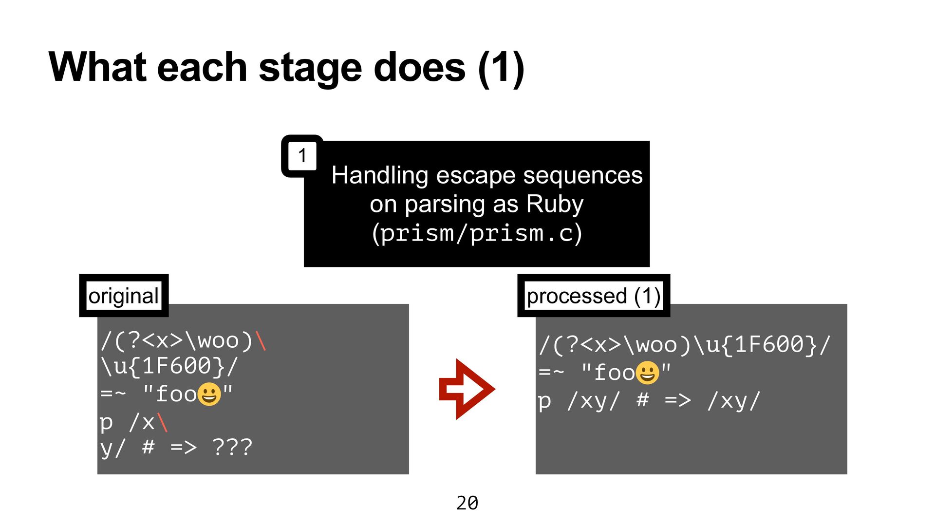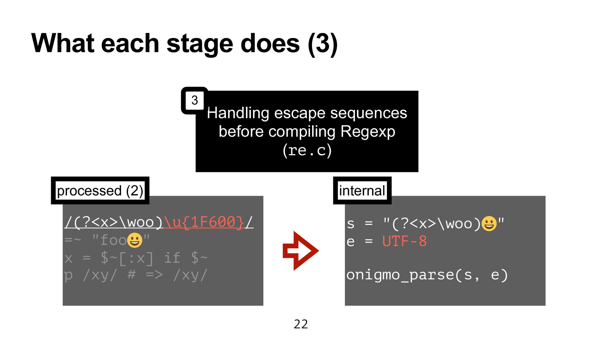 Ruby (prism/parse.c) Handling escape sequences before compiling Regexp (re.c) Fast checking for collecting named captures (prism/regexp.c) Parsing with Onigmo (regparse.c) 1 2 3 4
