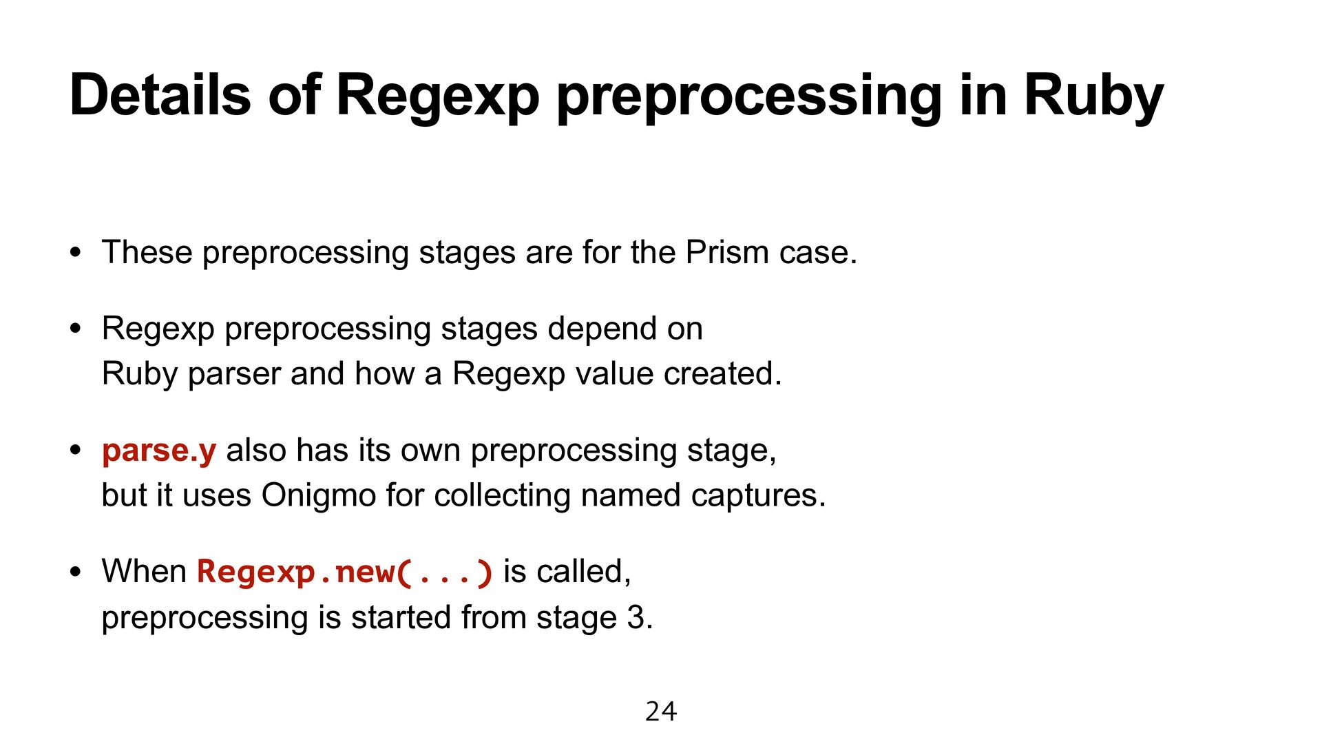 are for the Prism case. • Regexp preprocessing stages depend on Ruby parser and how a Regexp value created. • parse.y also has its own preprocessing stage, but it uses Onigmo for collecting named captures. • When Regexp.new(...) is called, preprocessing is started from stage 3. 24
