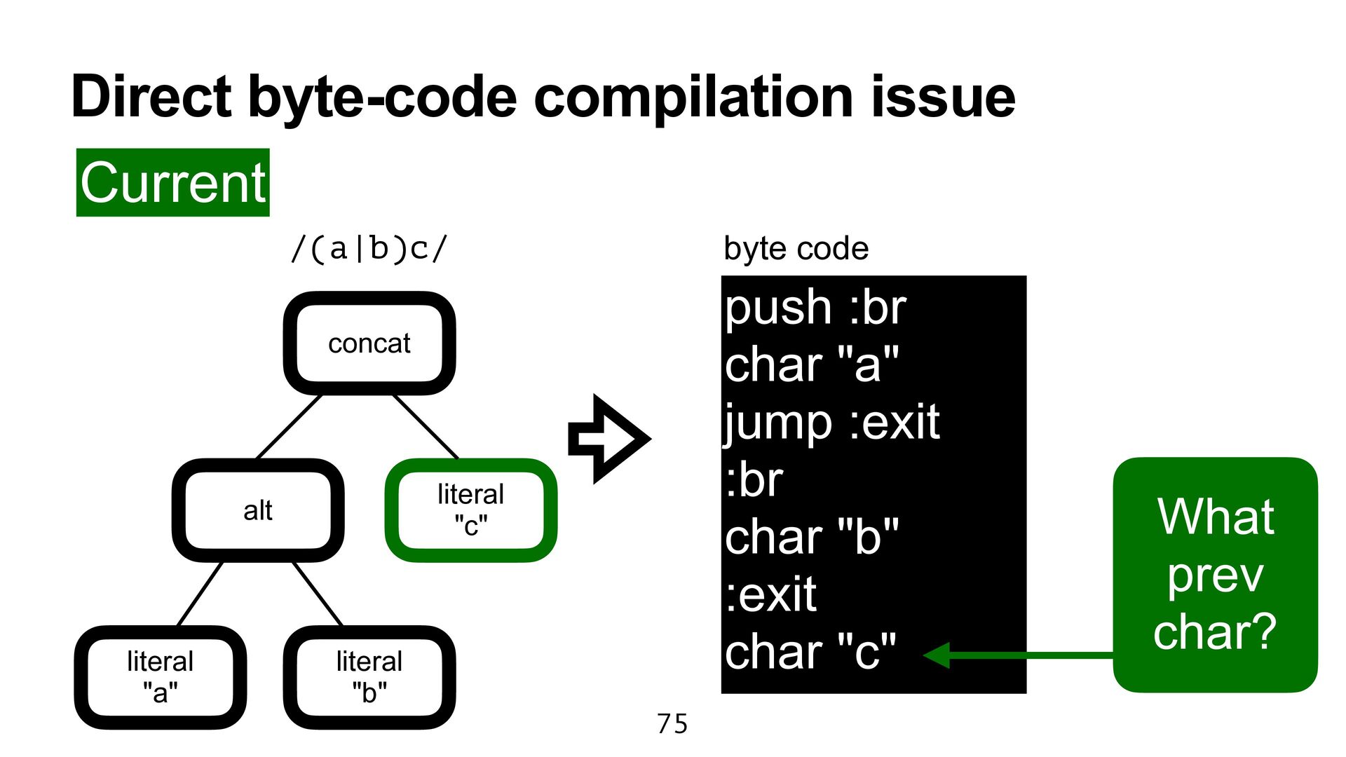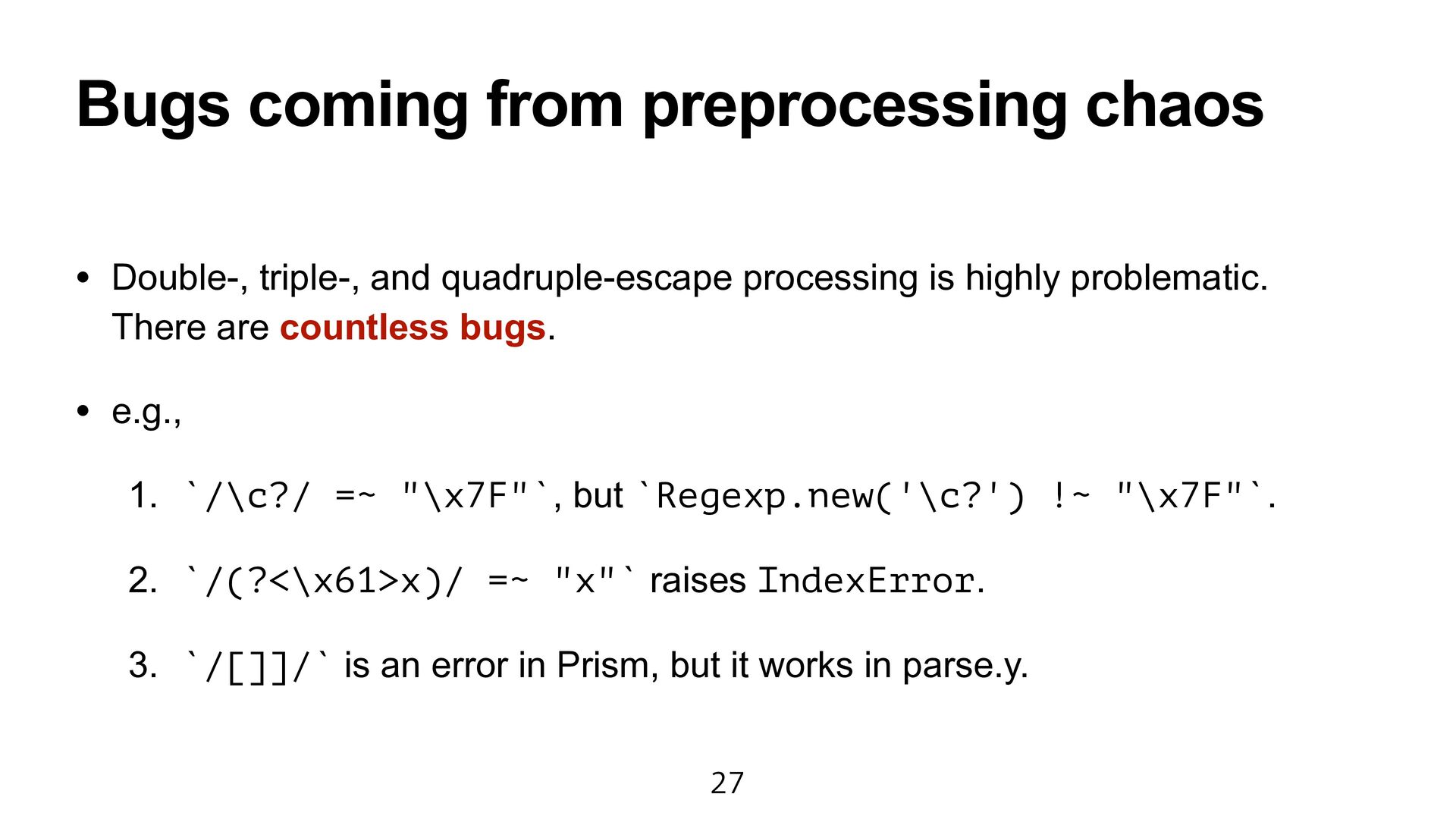 processing is highly problematic. There are countless bugs. • e.g., 1. `/\c?/ =~ "\x7F"`, but `Regexp.new('\c?') !~ "\x7F"`. 2. `/(?<\x61>x)/ =~ "x"` raises IndexError. 3. `/[]]/` is an error in Prism, but it works in parse.y. 27