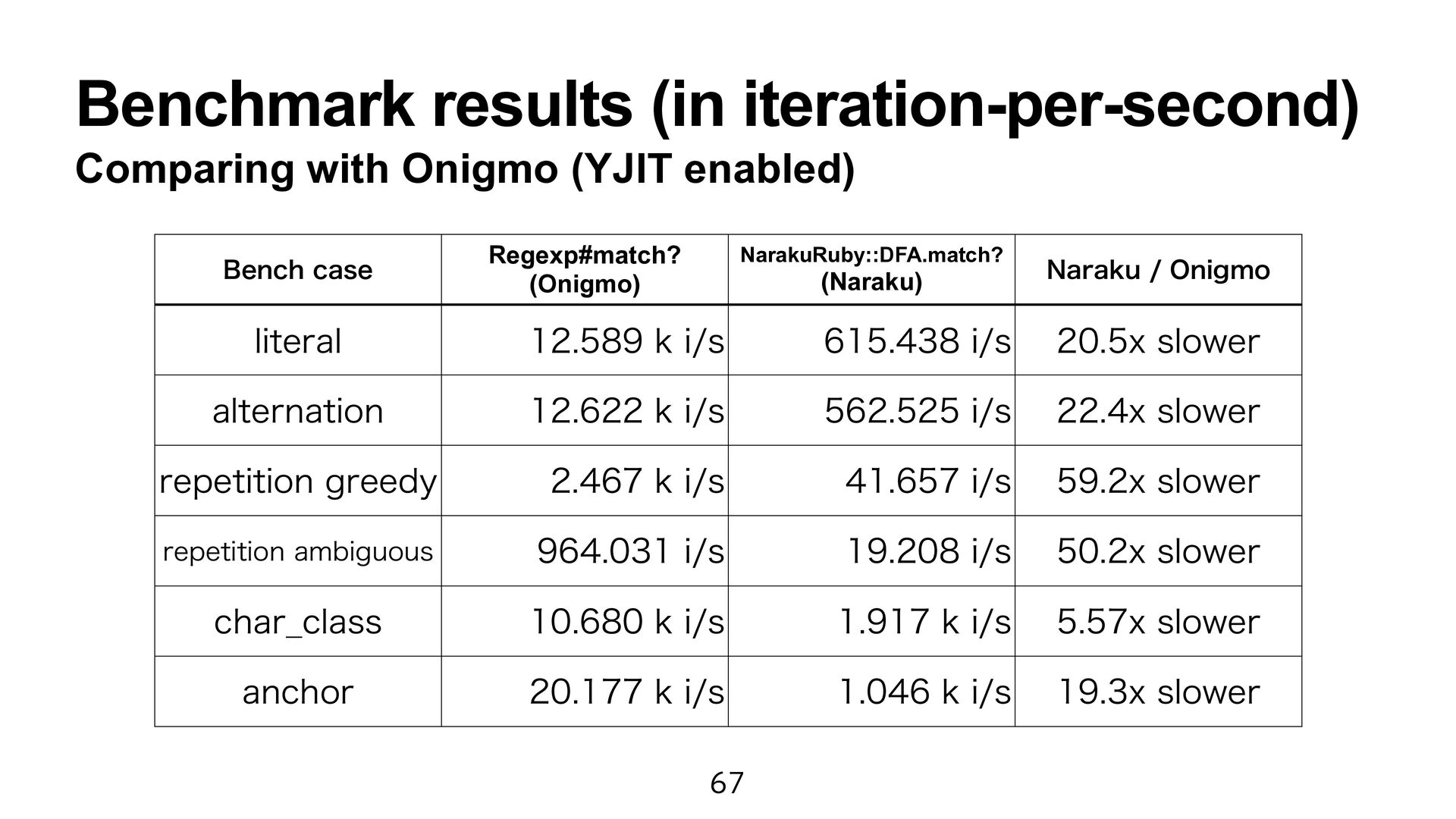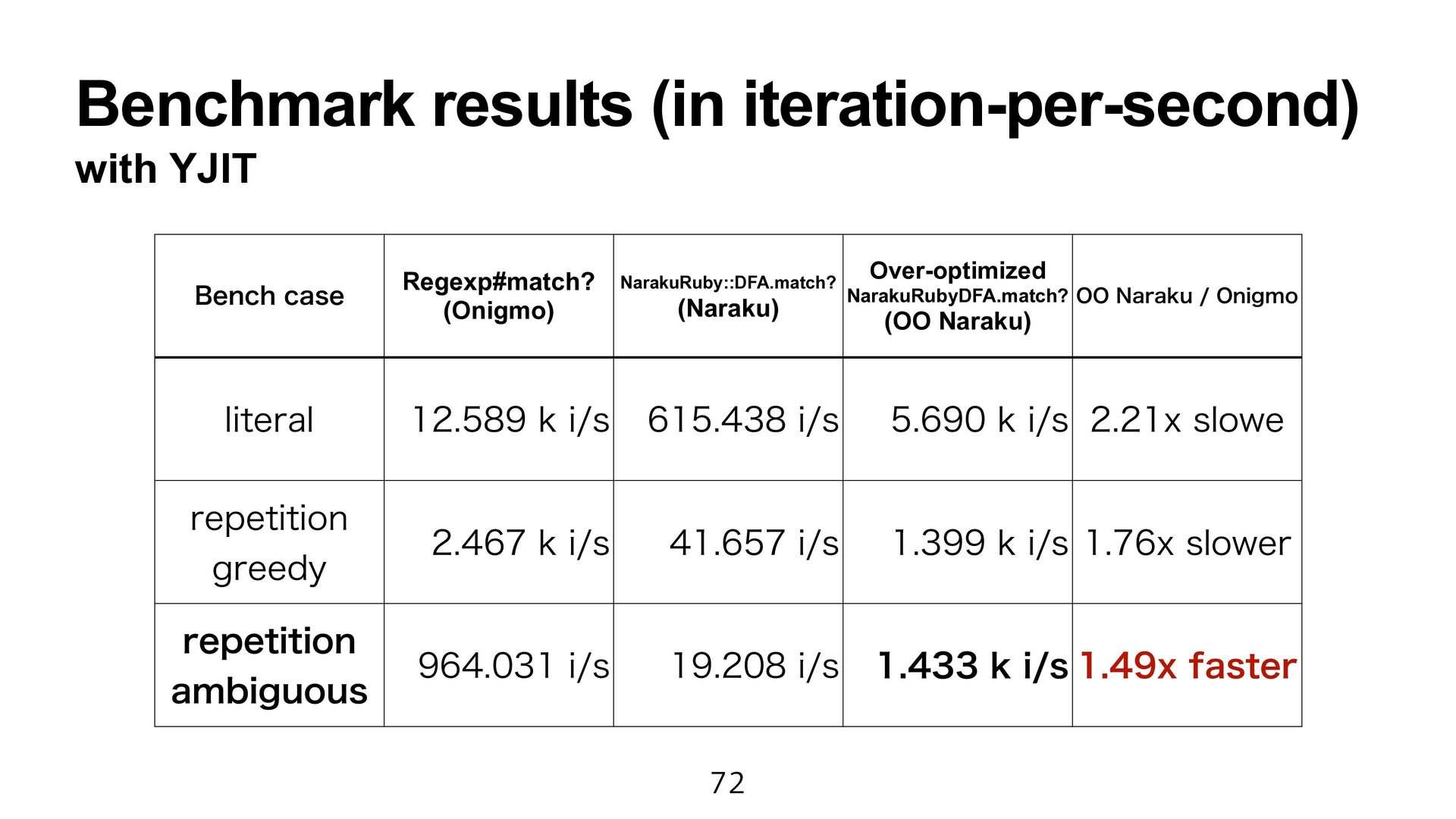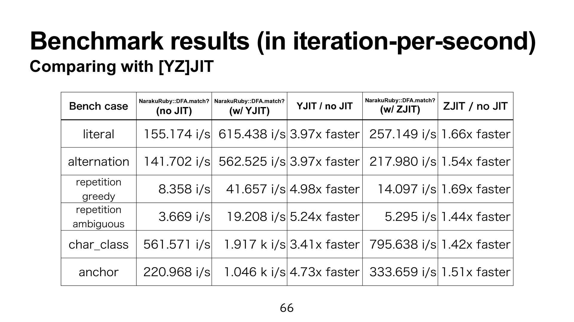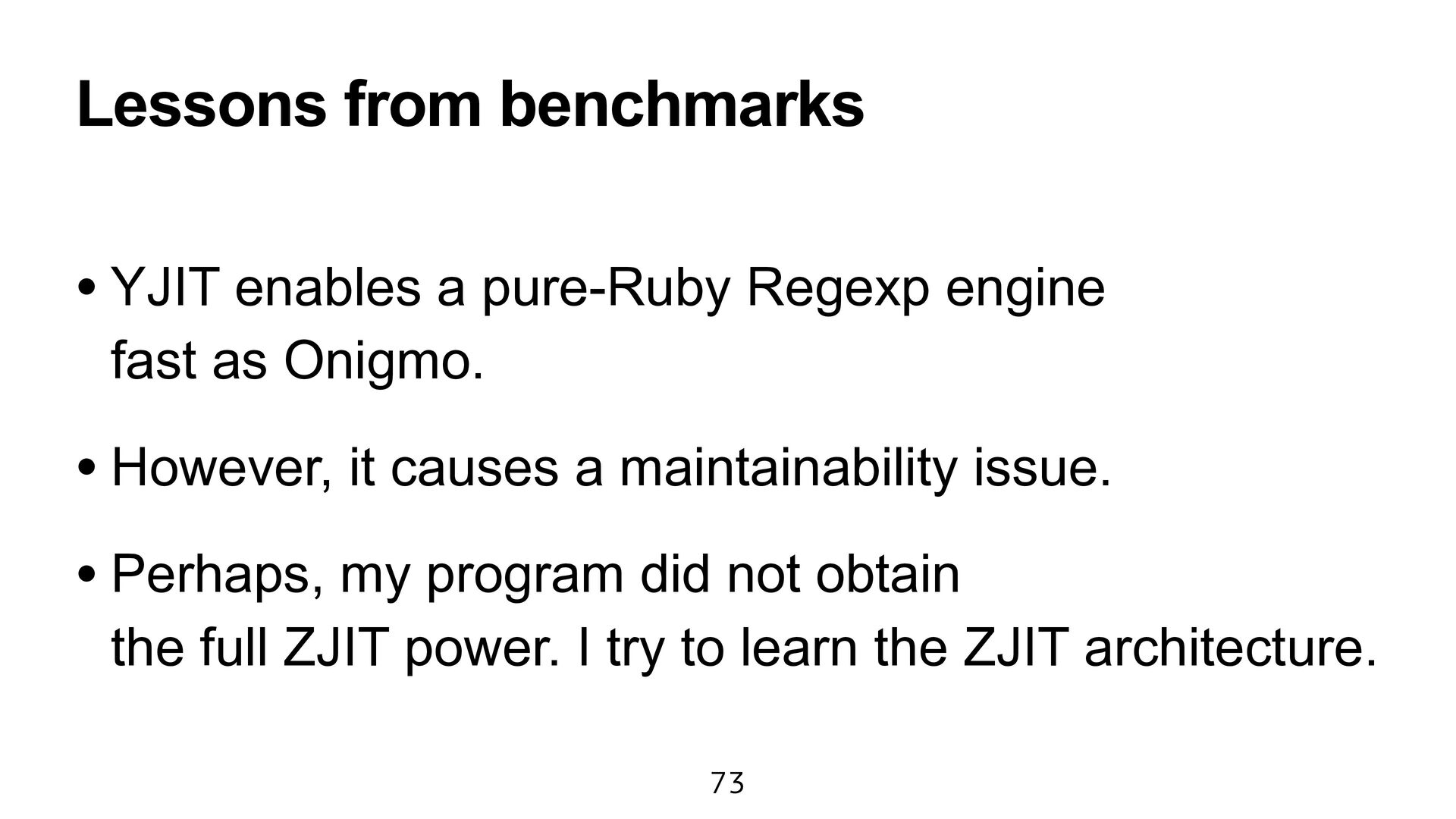 engine fast as Onigmo. • However, it causes a maintainability issue. • Perhaps, my program did not obtain the full ZJIT power. I try to learn the ZJIT architecture.