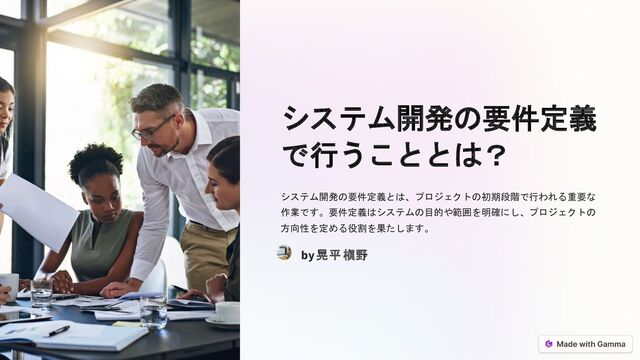 システム開発の要件定義 で行うこととは? システム開発の要件定義とは、プロジェクトの初期段階で行われる重要な 作業です。要件定義はシステムの目的や範囲を明確にし、プロジェクトの 方向性を定める役割を果たします。 by 晃平 槇野