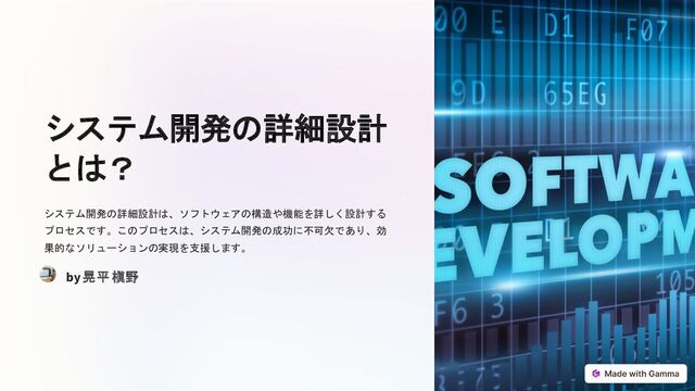 システム開発の詳細設計 とは? システム開発の詳細設計は、ソフトウェアの構造や機能を詳しく設計する プロセスです。このプロセスは、システム開発の成功に不可欠であり、効 果的なソリューションの実現を支援します。 by 晃平 槇野