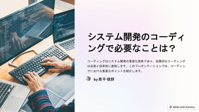 システム開発のコーディ ングで必要なことは? コーディングはシステム開発の重要な要素であり、効果的なコーディング は品質と効率性に直結します。このプレゼンテーションでは、コーディン グにおける重要なポイントを紹介します。 by 晃平 槇野