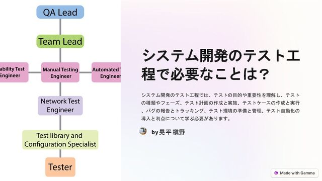 システム開発のテスト工 程で必要なことは? システム開発のテスト工程では、テストの目的や重要性を理解し、テスト の種類やフェーズ、テスト計画の作成と実施、テストケースの作成と実行 、バグの報告とトラッキング、テスト環境の準備と管理、テスト自動化の 導入と利点について学ぶ必要があります。 by 晃平 槇野